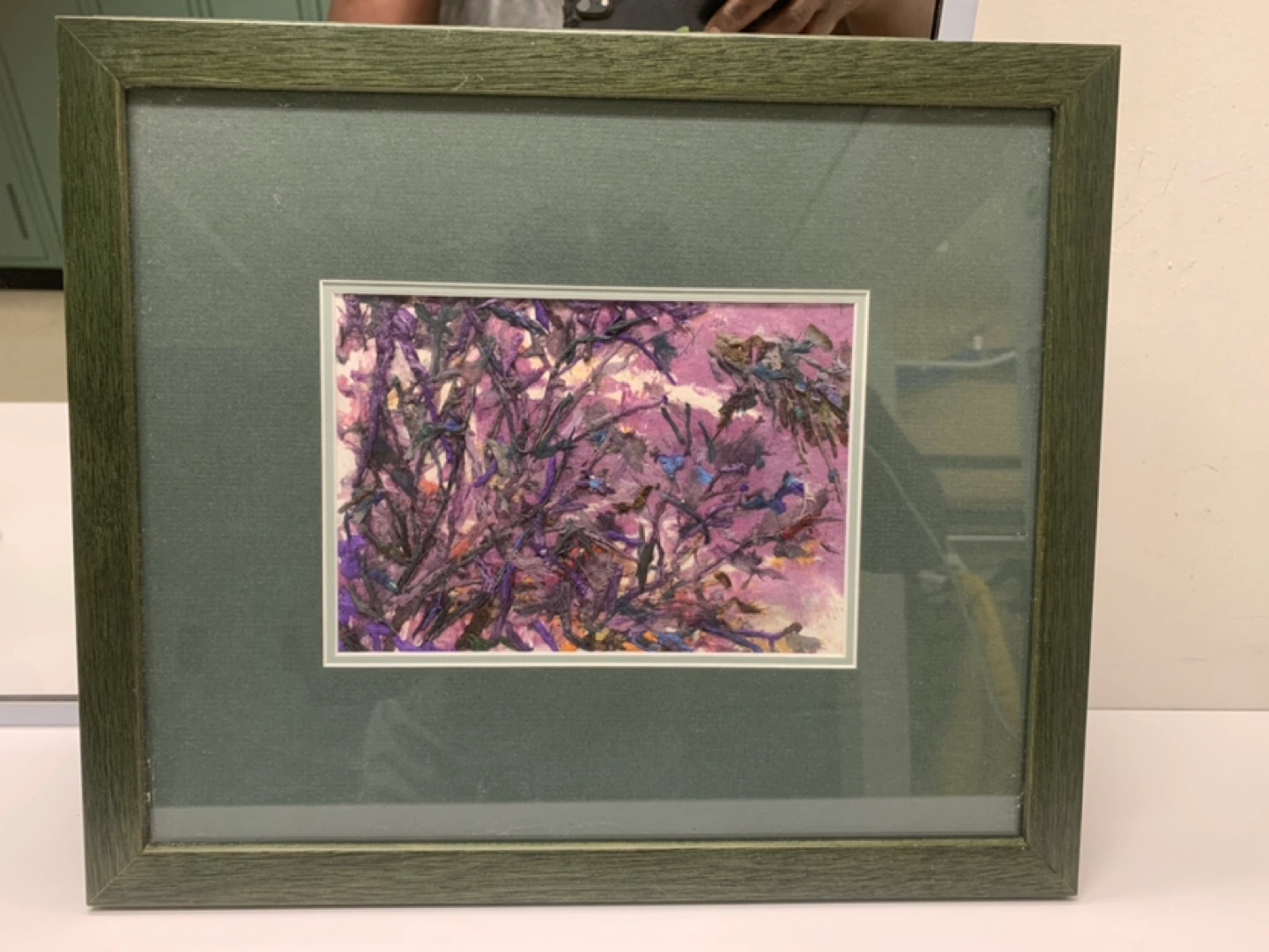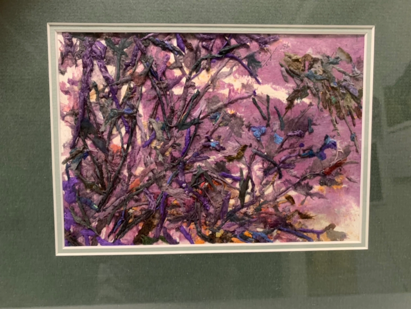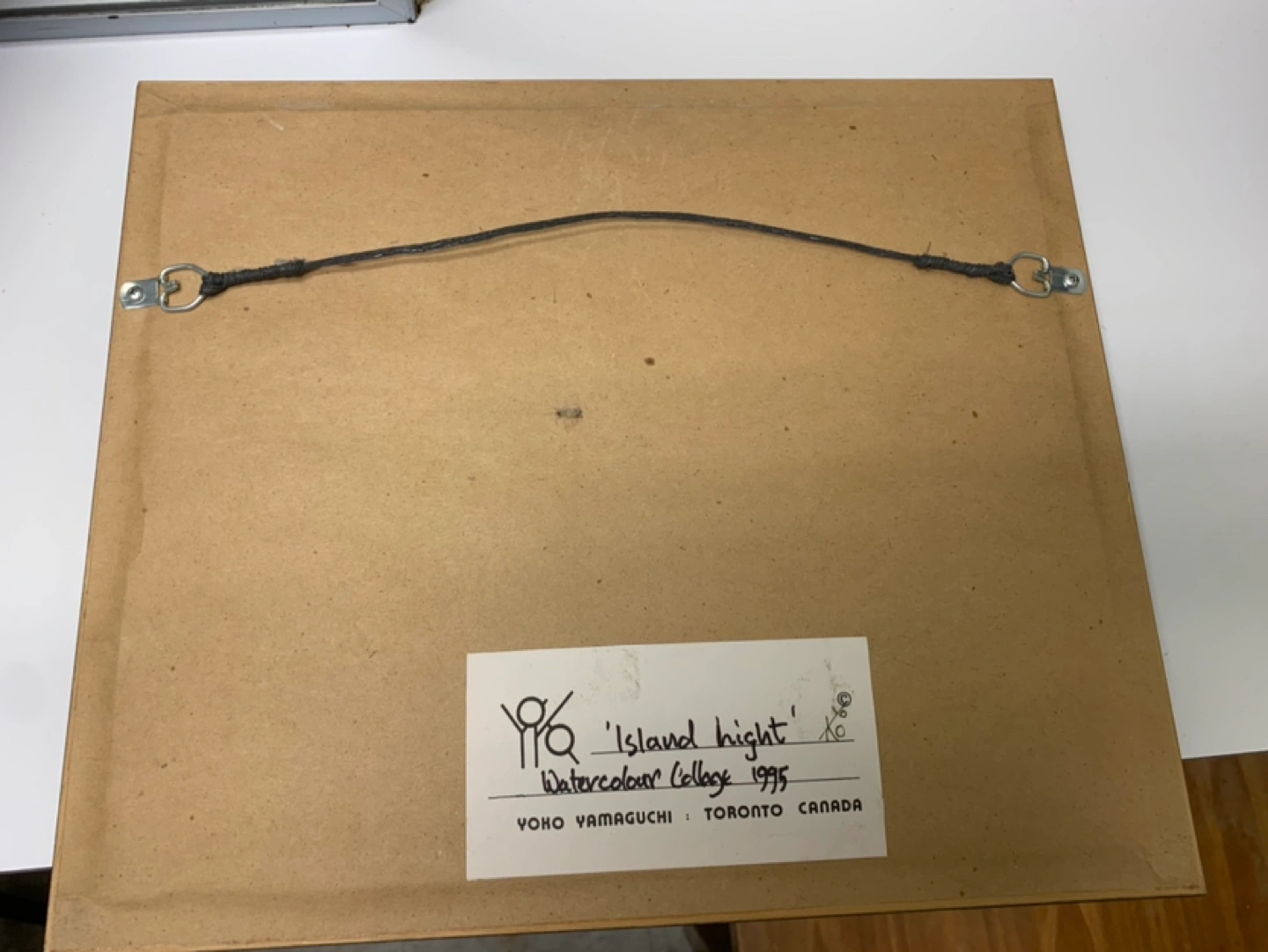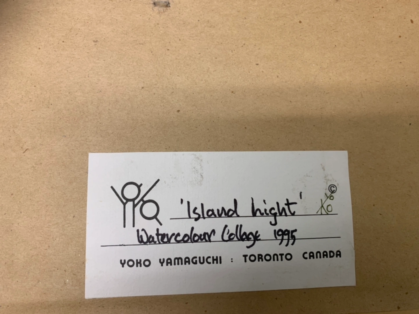 Framed original artwork by Yoho Yamaguchi, titled 'Island Light'. Watercolour and collage, dated 1995. Width 14x12 inches