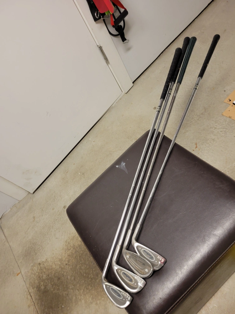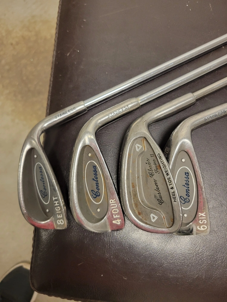 Set of 4 golf clubs, 4 iron, 5 iron, 6 iron and 8 iron. Stainless steel.