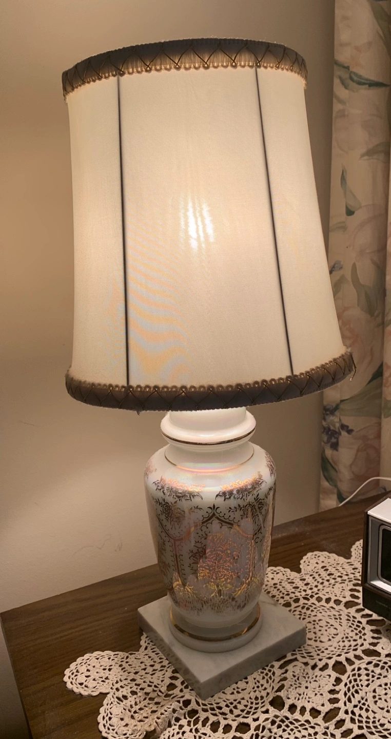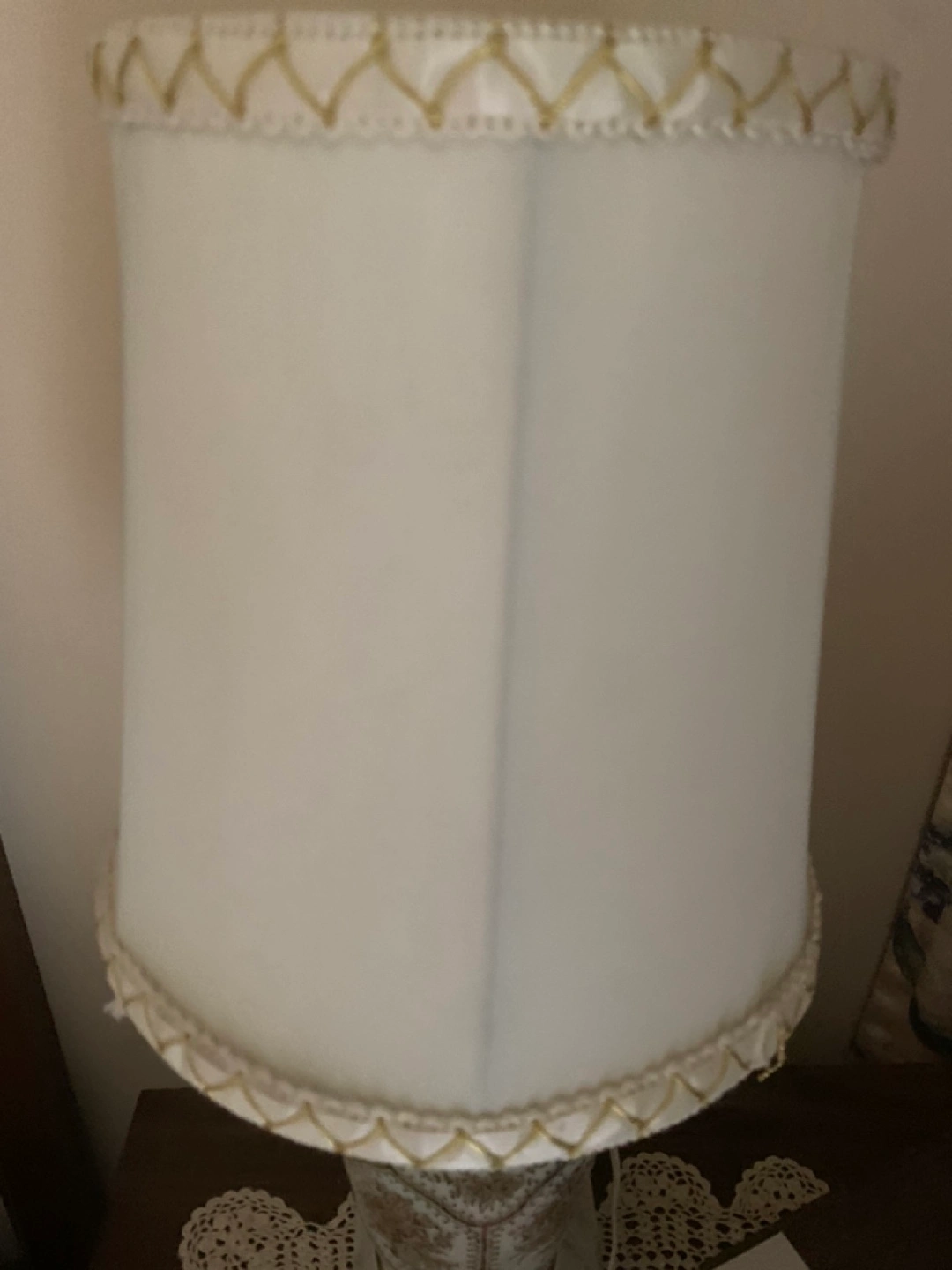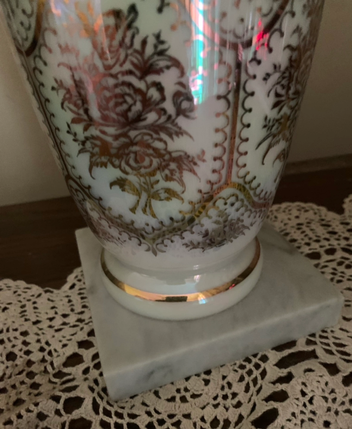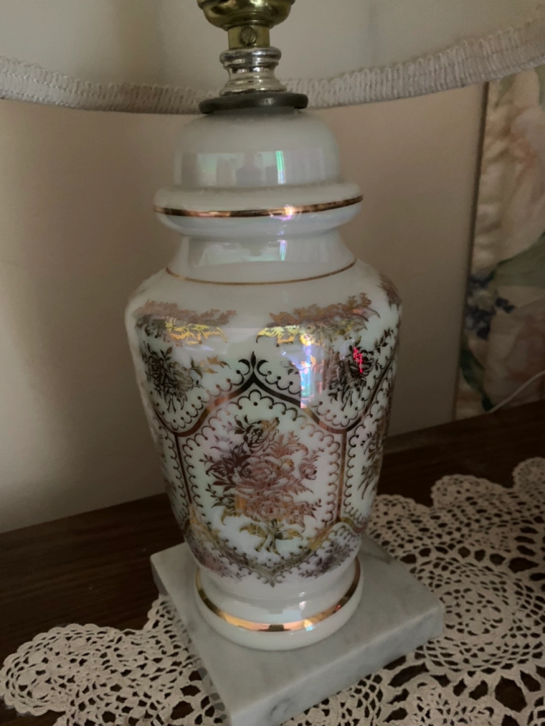 Set of 2 Matching Lamps White porcelain lamps with gold floral accents on a marble base. Includes 2 white lampshades with gold trim. Excellent condition- like new Moving sale - smoke free & pet free household