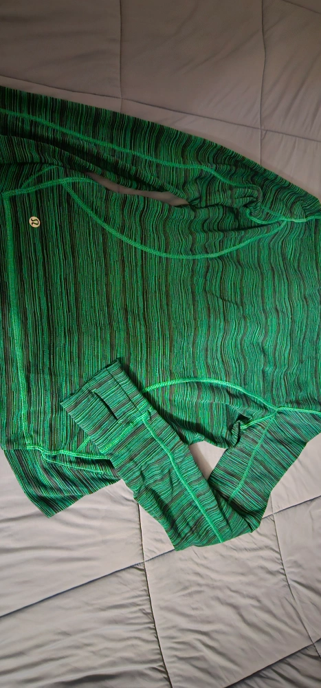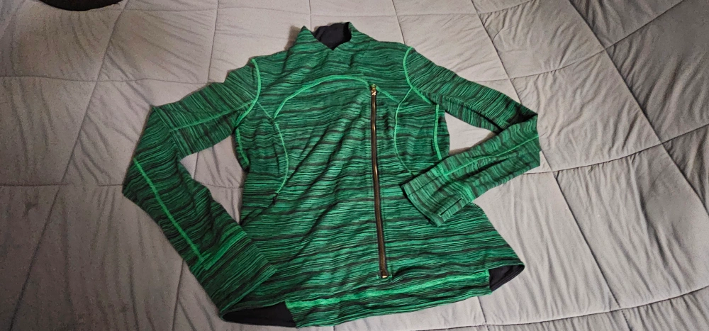 Brand-new green-and-navy-blue striped running jacket with a zipper. Long sleeves with thumbholes. Has two zippered front pockets.