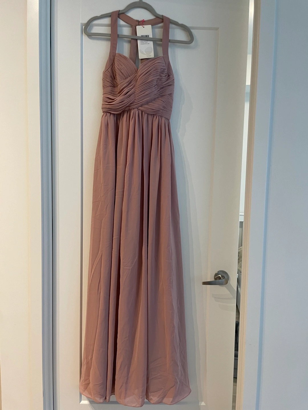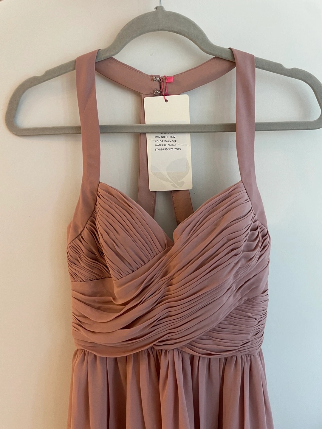Stunning bridesmaid dress in dusty pink purchased from KF Bridal New with tag, never worn, not altered Material: chiffon Colour: dusty pink Size: XXS / US 2 See size chart in the photos for measurements Retail price USD$118 (around CAD $160 before shipping & tax)