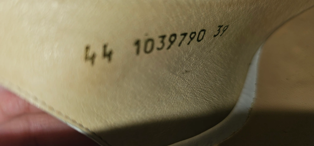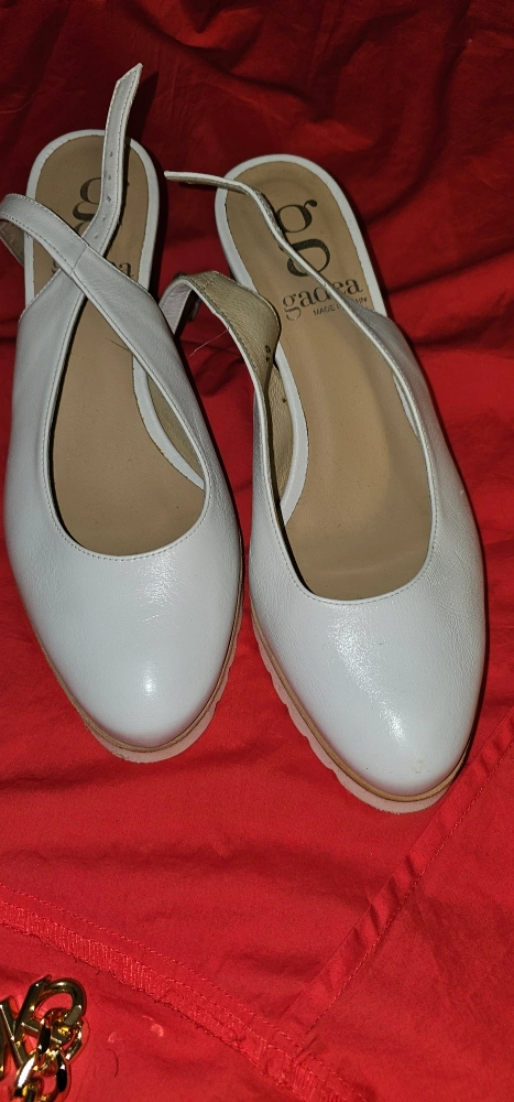 White leather heels with a chunky heel, slingback strap, and a platform. Size 39. The heel is about 4 fingers tall. They are very comfortable. I tried them on and walked a little around the house, but they are a bit tight on me.