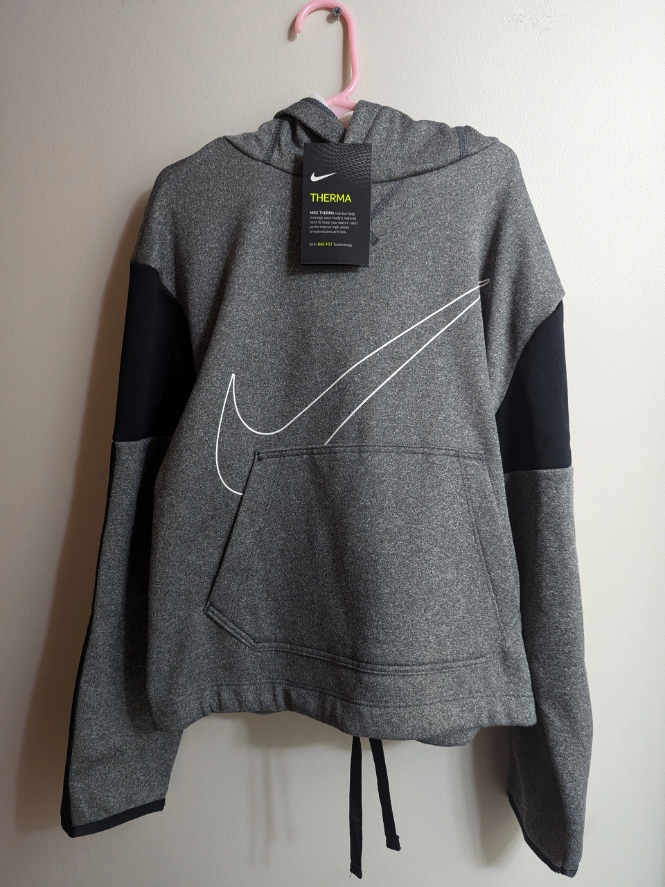 Brand New with Tags Nike Grey and black Therma hoodie with a white swoosh logo. Kids Size Medium (Unisex) Asking $25. Pick up in Pickering or can meet in Markham.