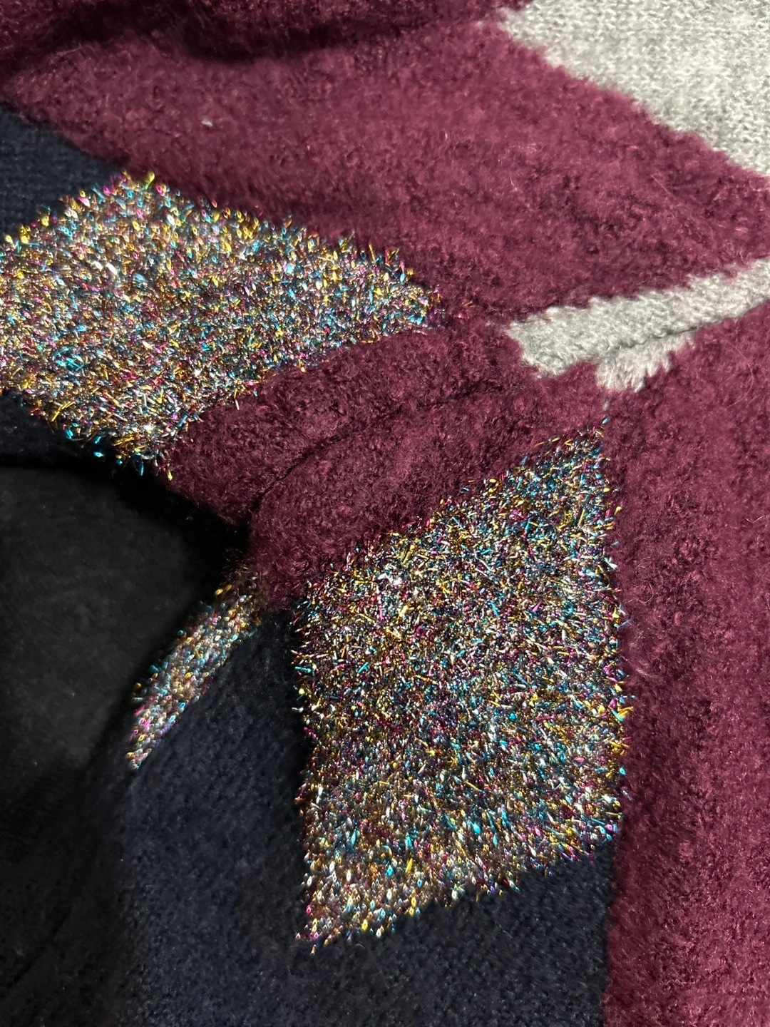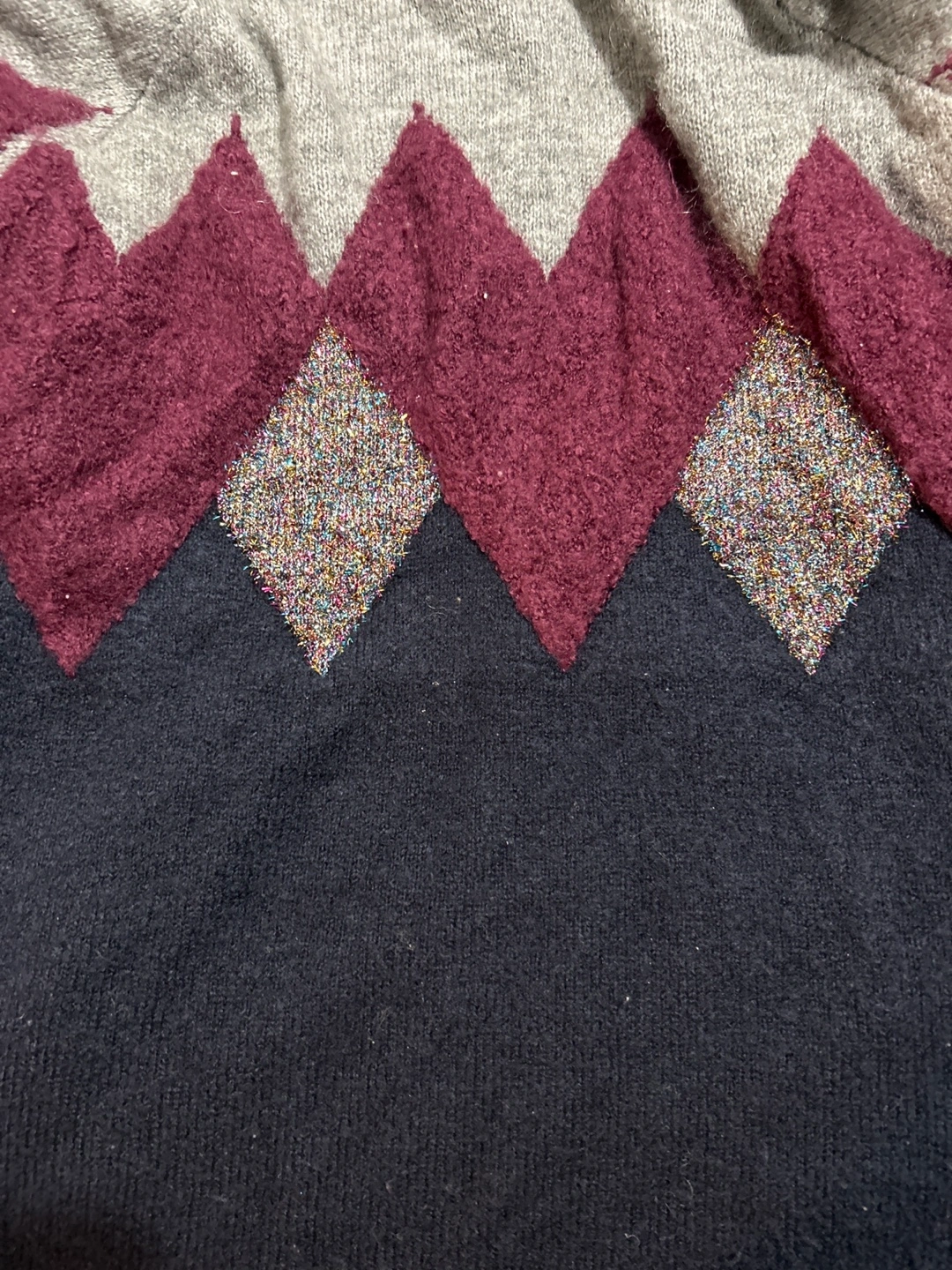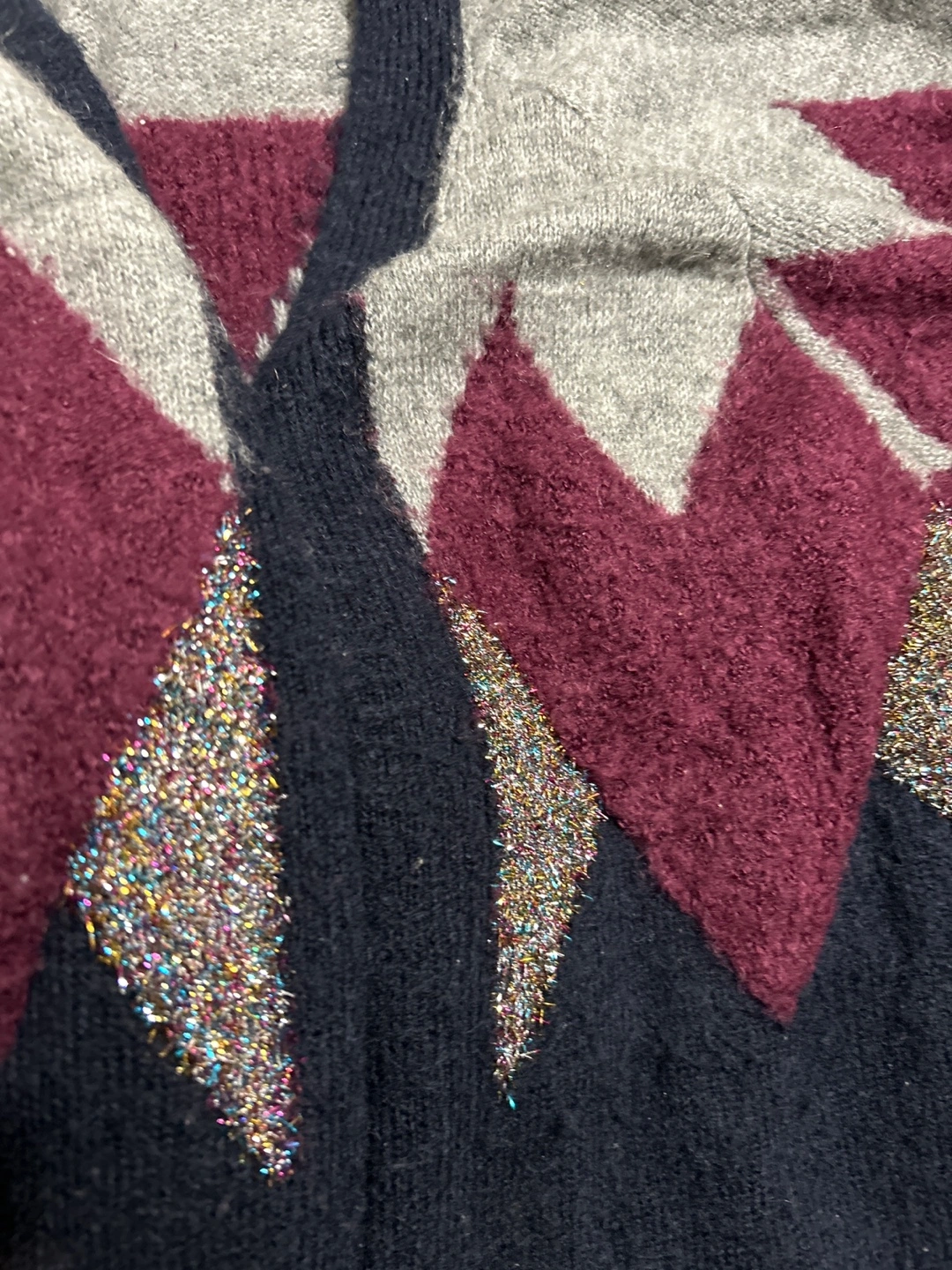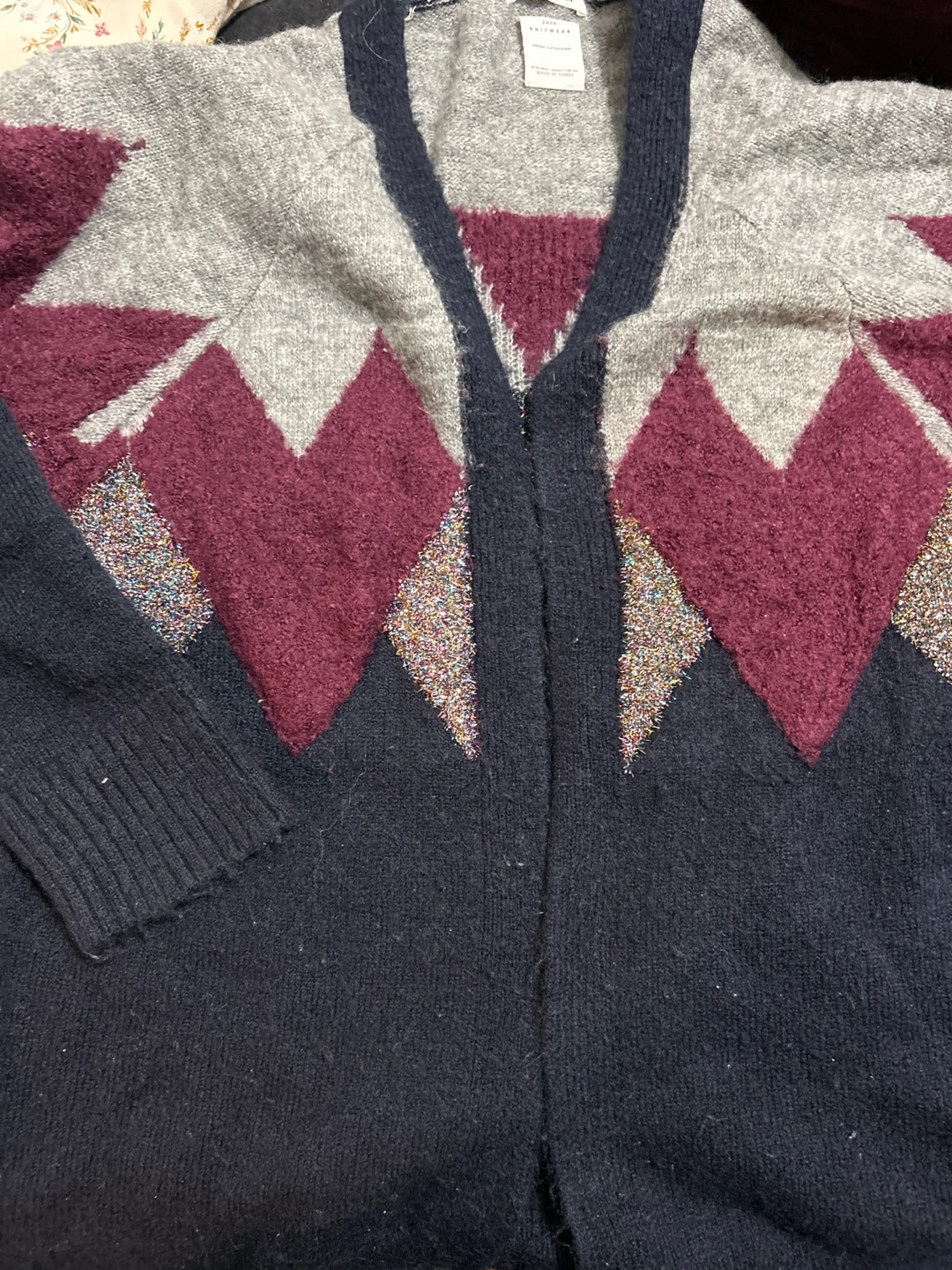 #freecycle #freecycle Zara Knitwear Women's quarter length -sleeved cardigan with a burgundy, grey, metallic threading and black geometric pattern. Features glitter detailing. Tried on, never wore