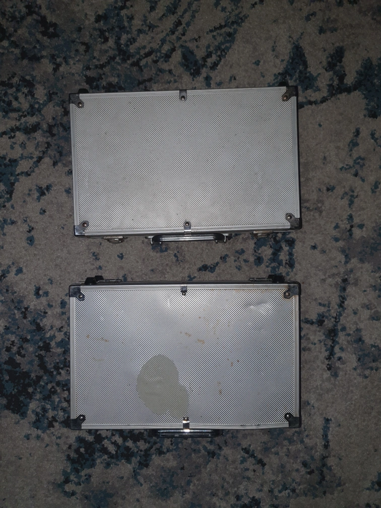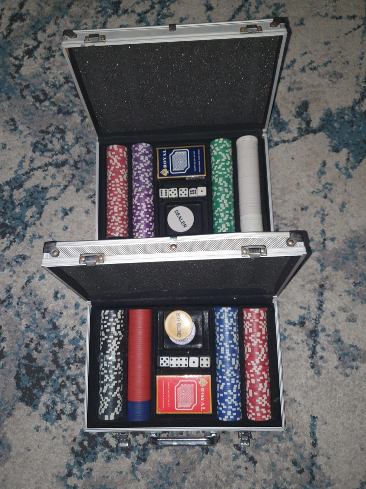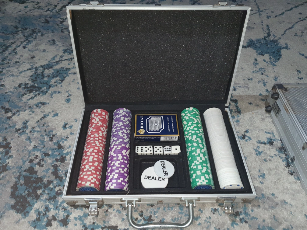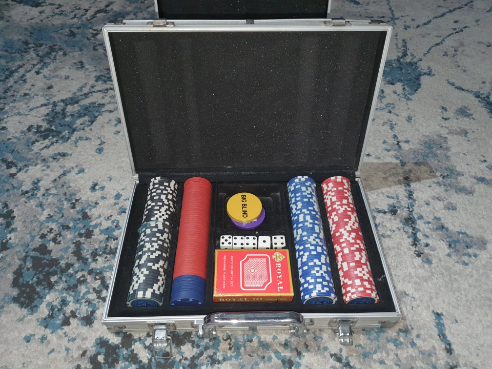 Poker set with aluminum case. Includes chips, cards, and dice.
