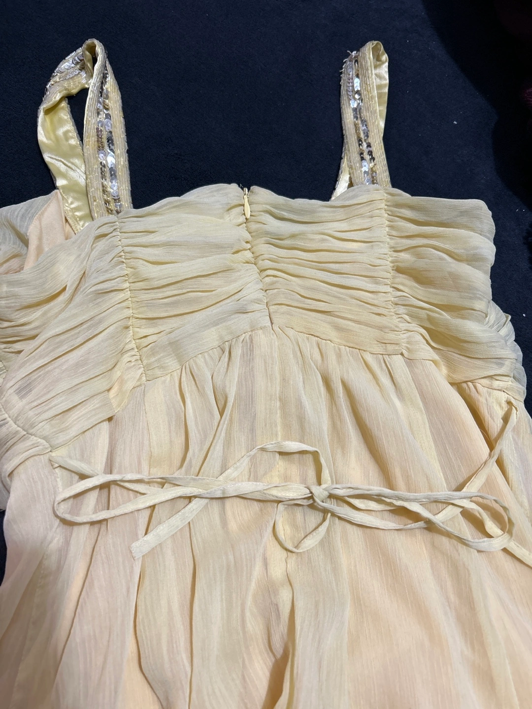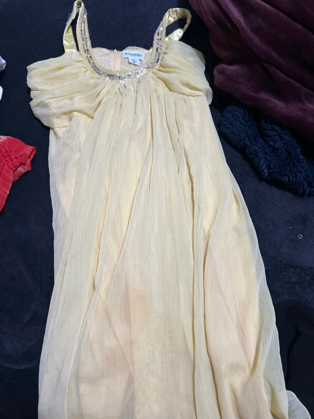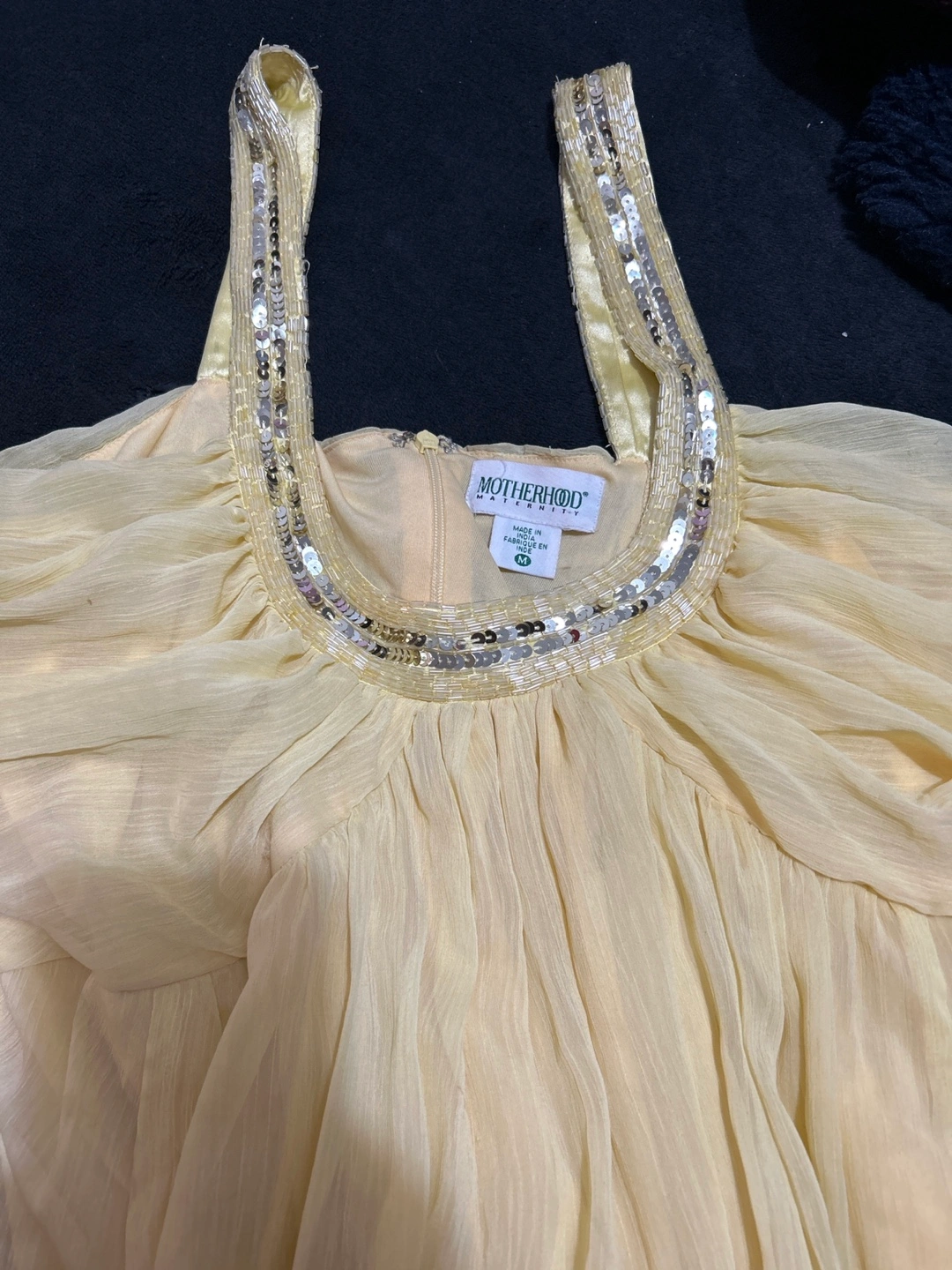 Yellow maxi dress with sequined straps. Size 10./Medium This dress falls on any individual nicely and even though it’s a maternity dress, it’s still looks good on someone that’s not pregnant also