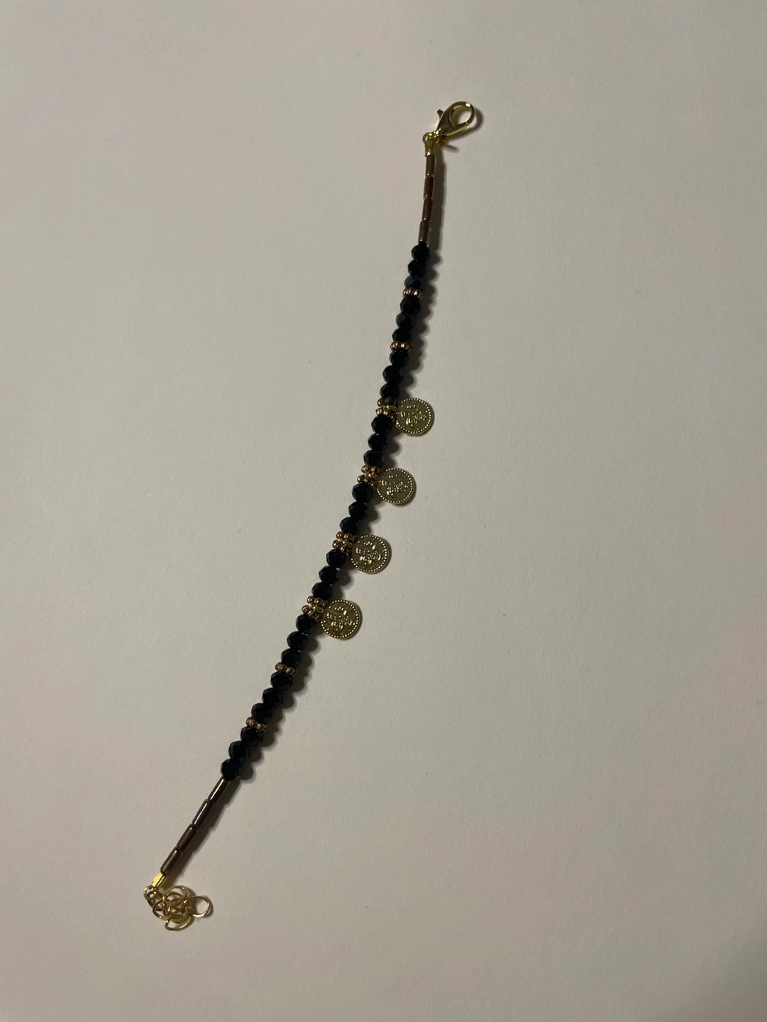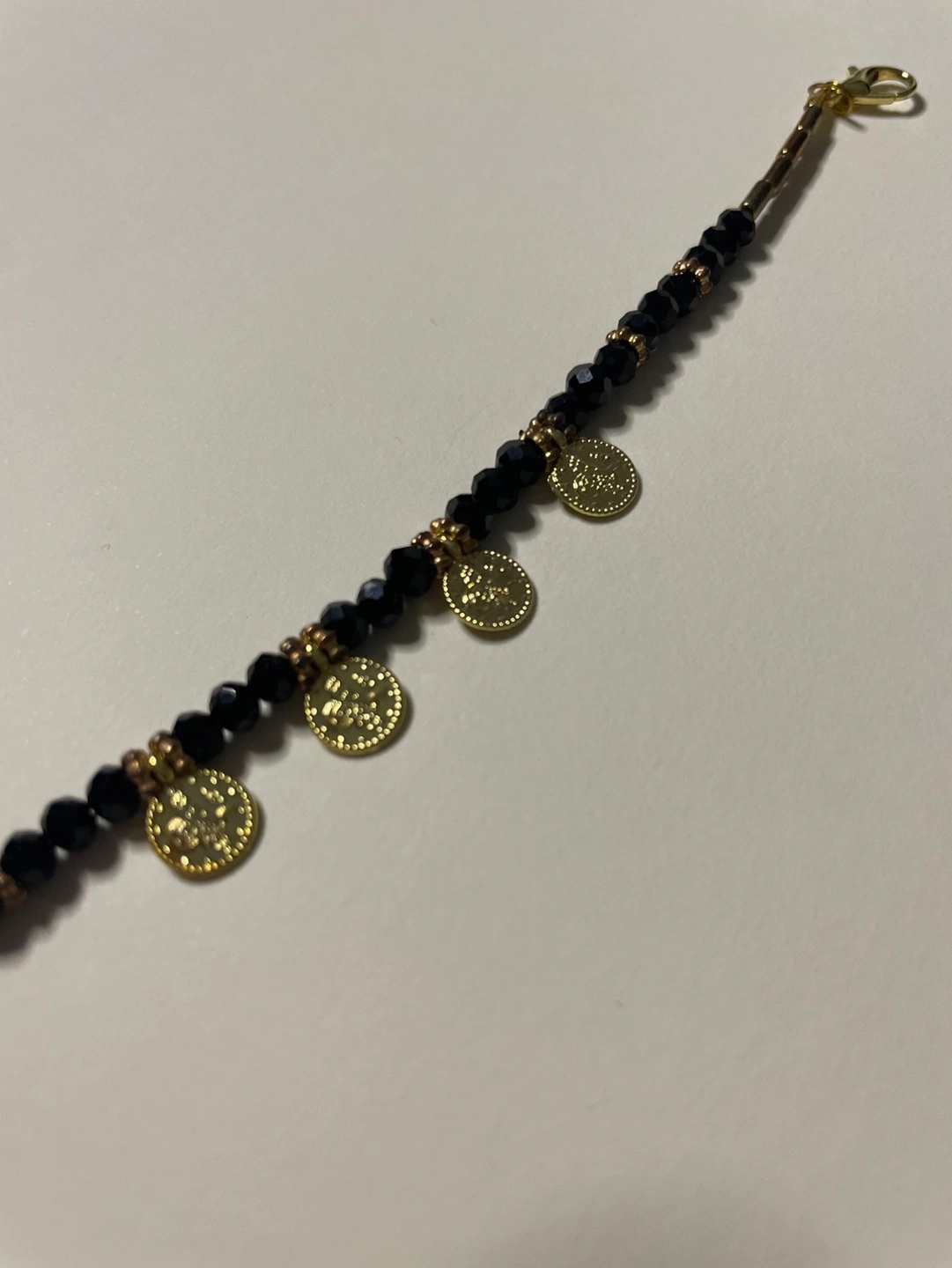 Black beaded bracelet with gold coin charms. Adjustable length.