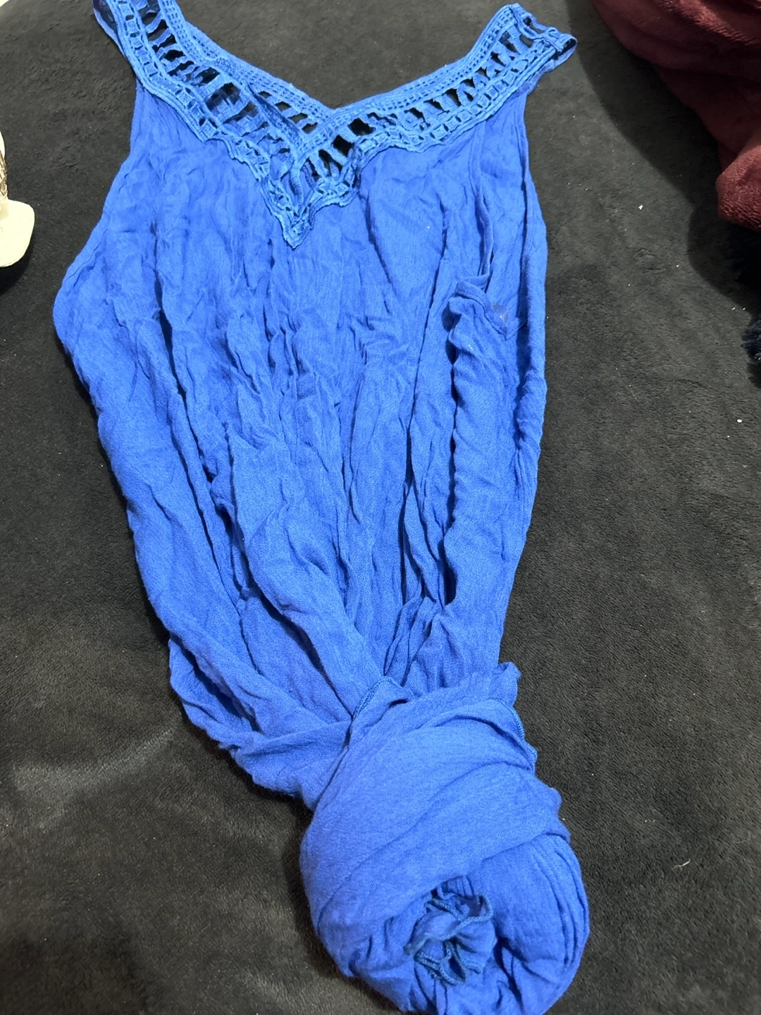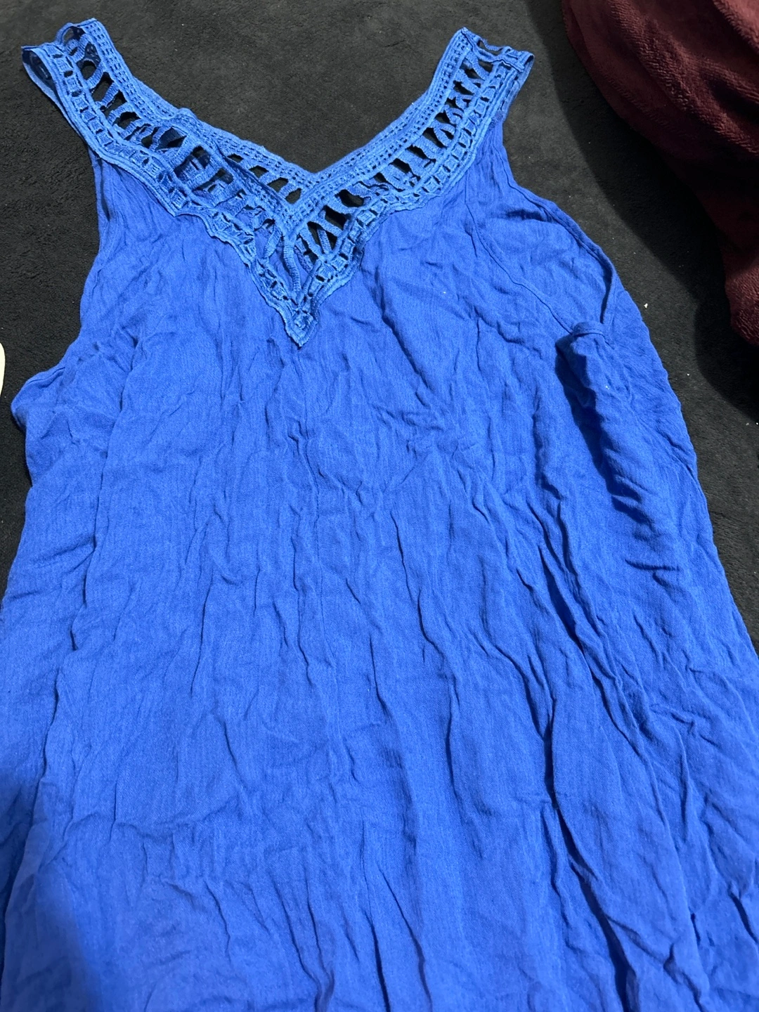 #freecycle Sleeveless blue top with crochet look detailing around the neckline. Light and flowy material. This is a beach dress or a sundress Only once, they never sued me to begin with might work on you though!