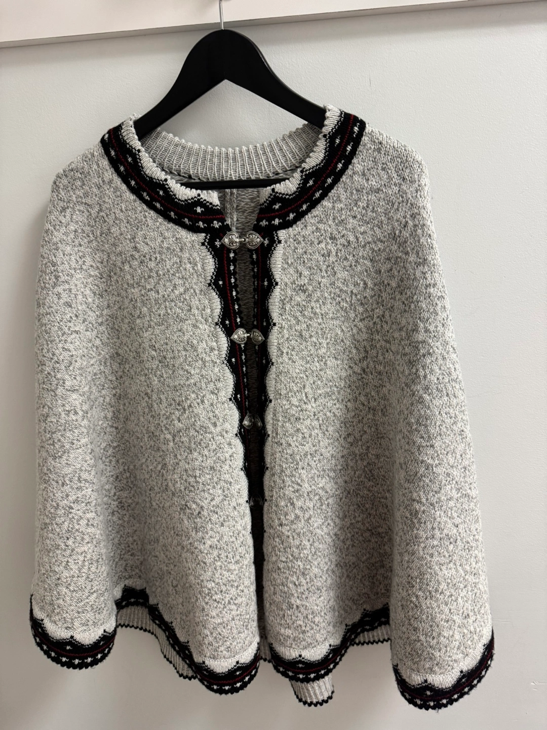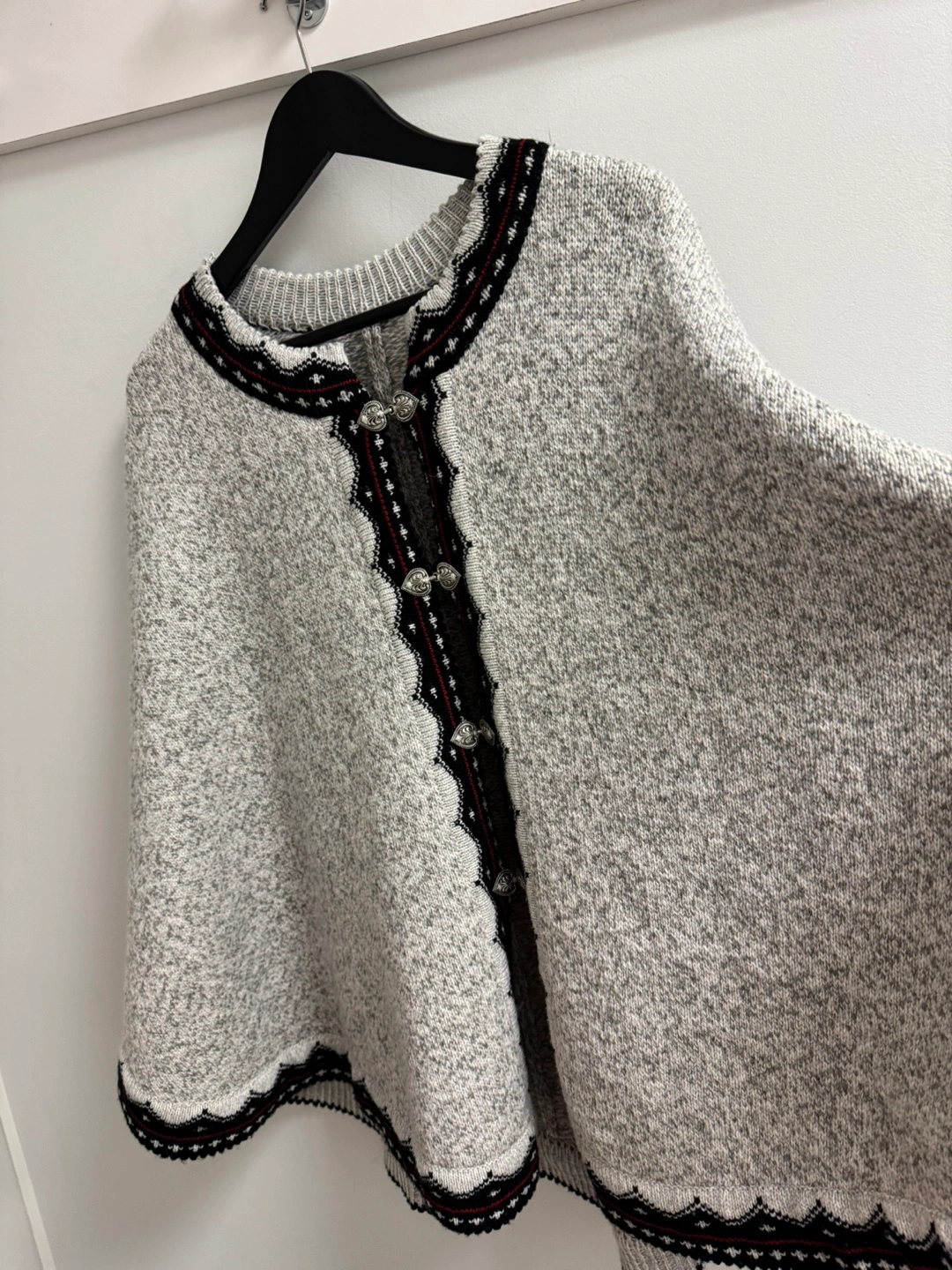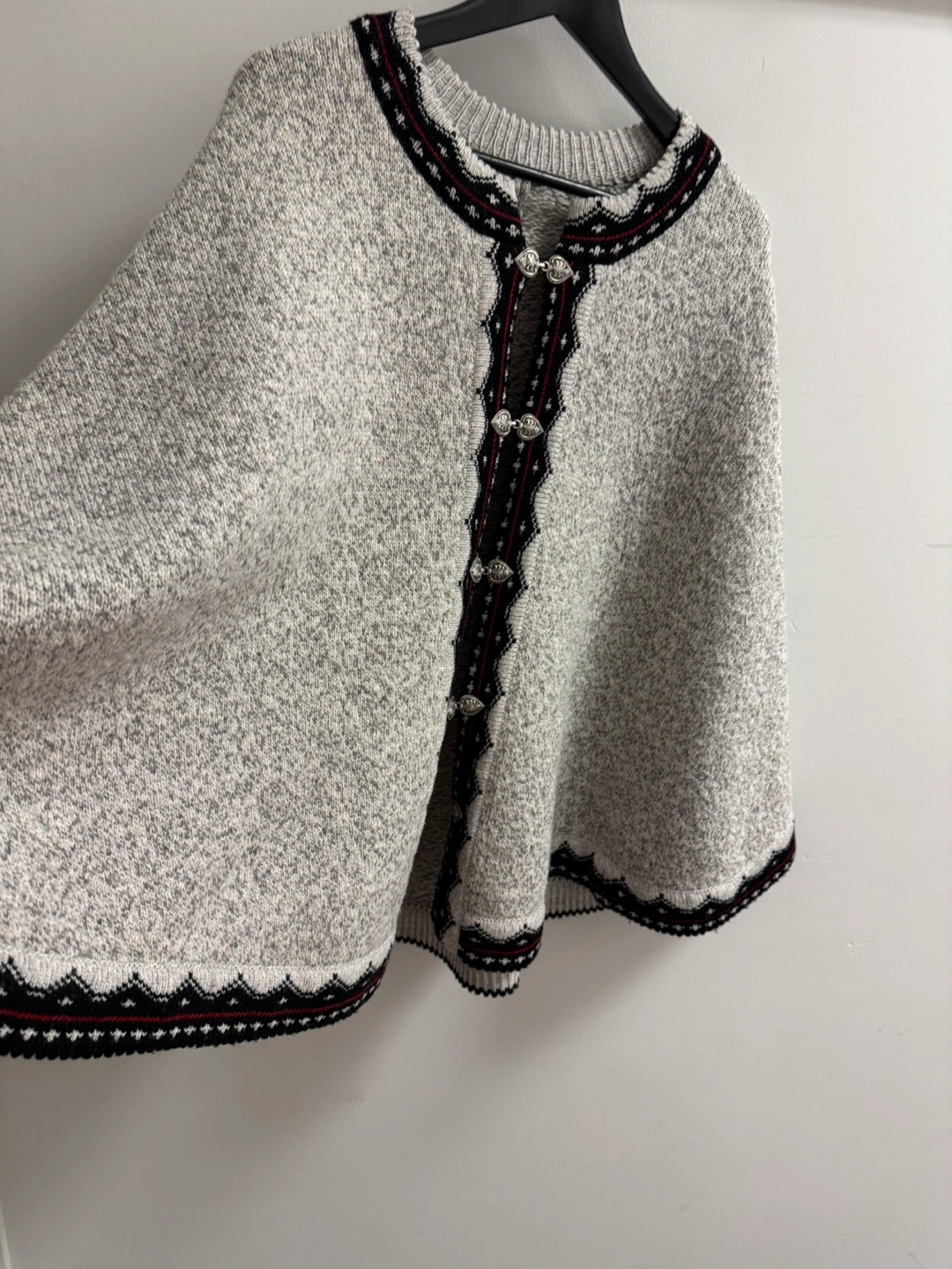 Grey knitted cape with black and red trim and silver buttons.