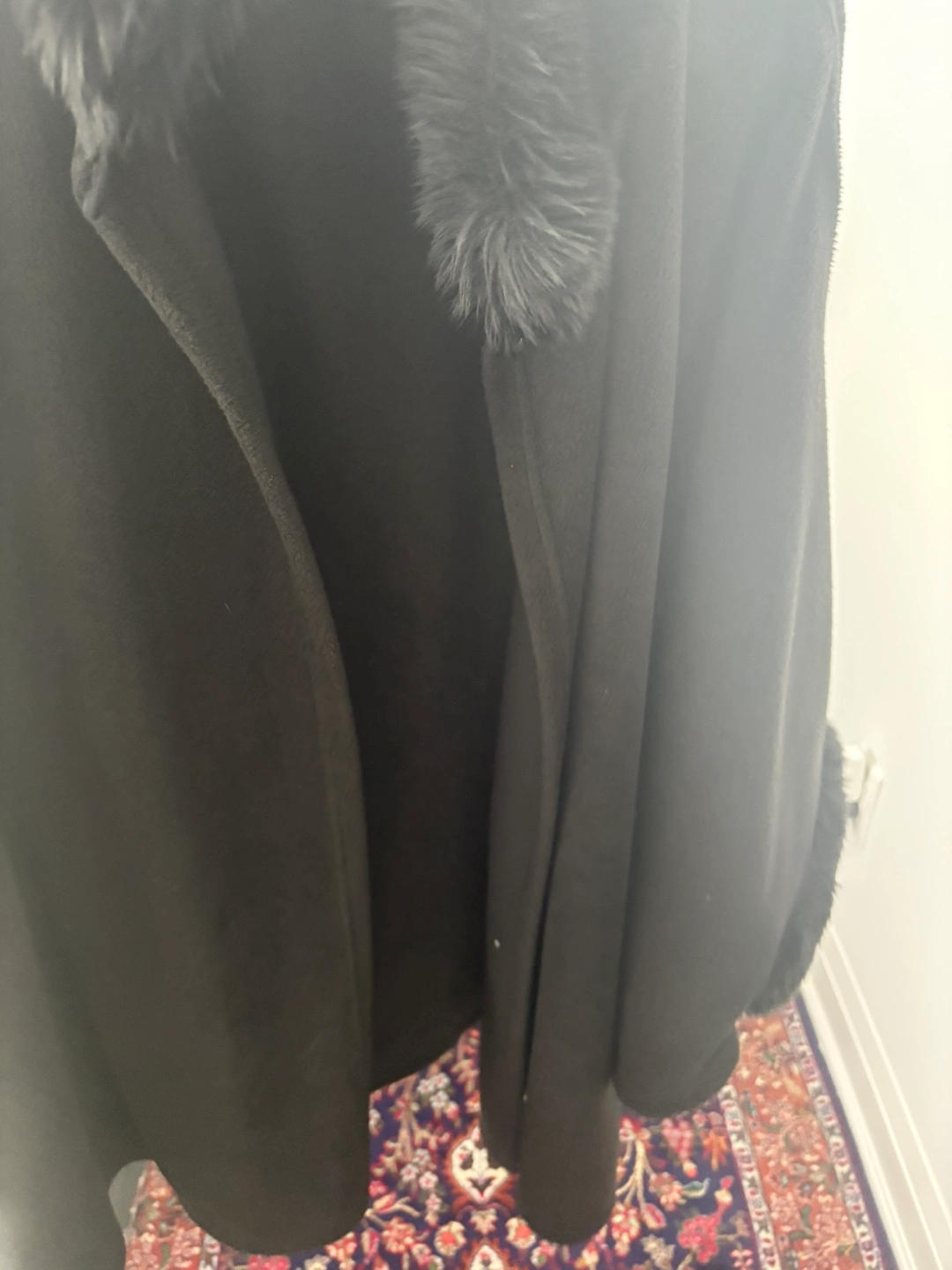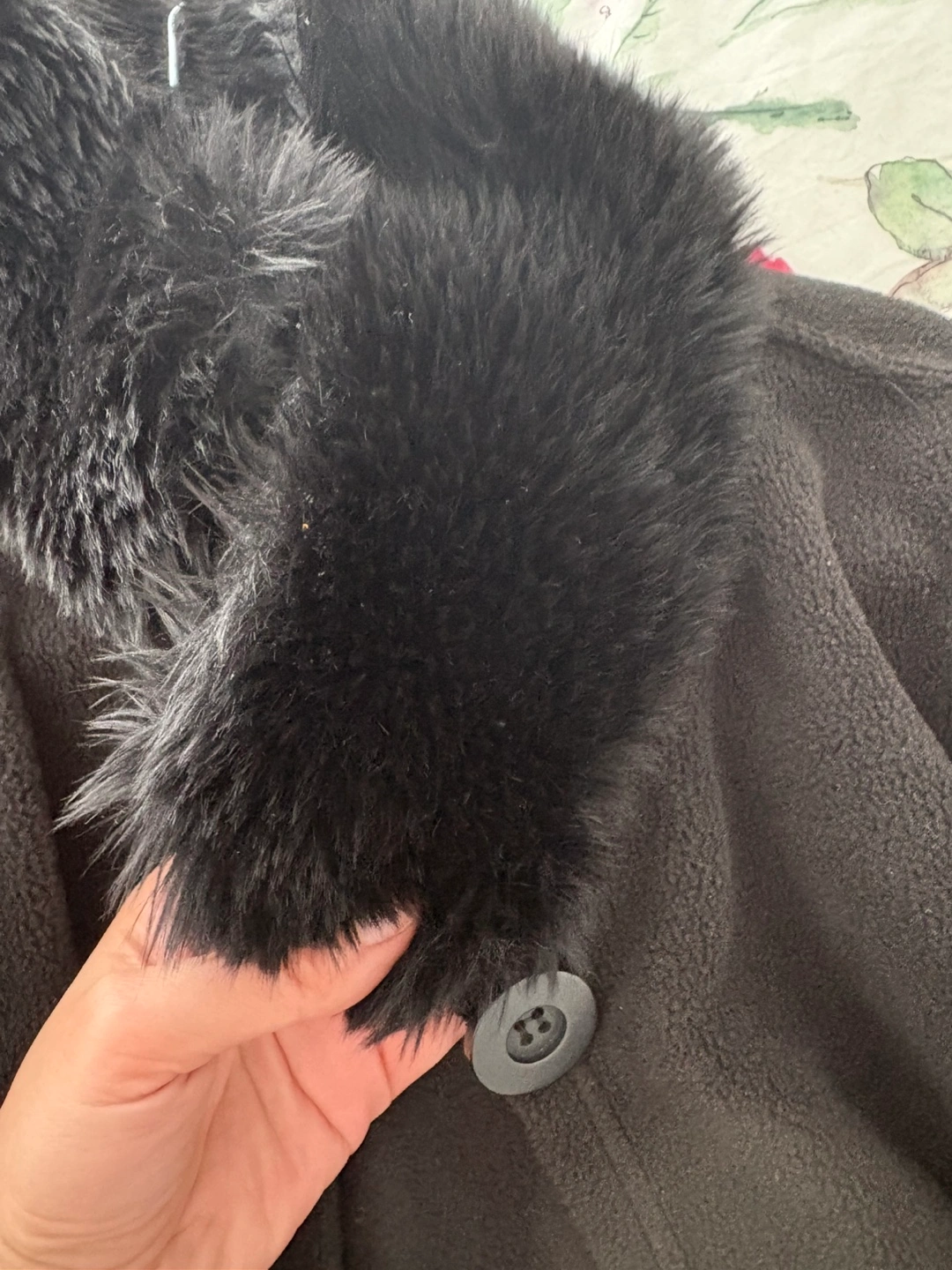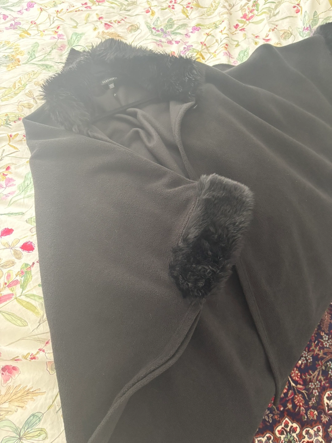Black coat with faux fur trim on the collar and sleeves. One button closure.