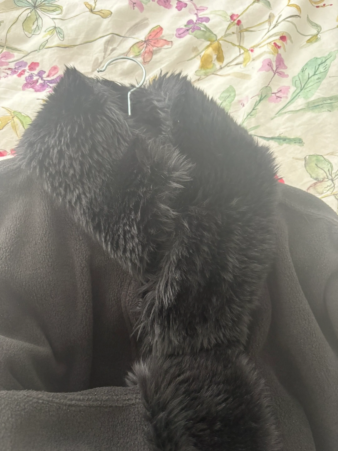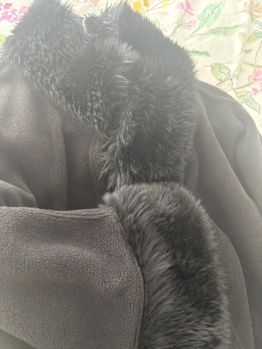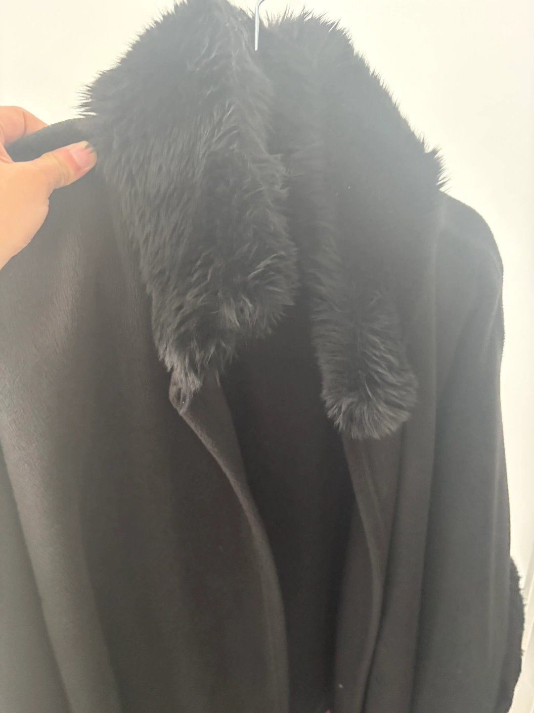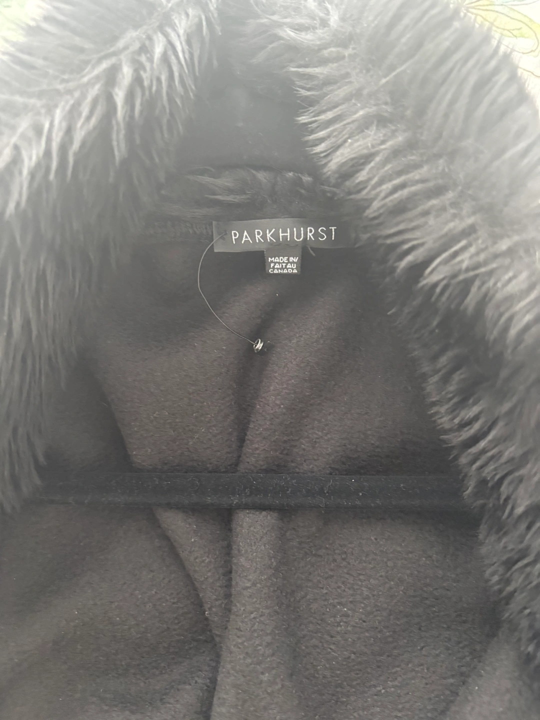 Black coat with faux fur trim on the collar and sleeves. One button closure.