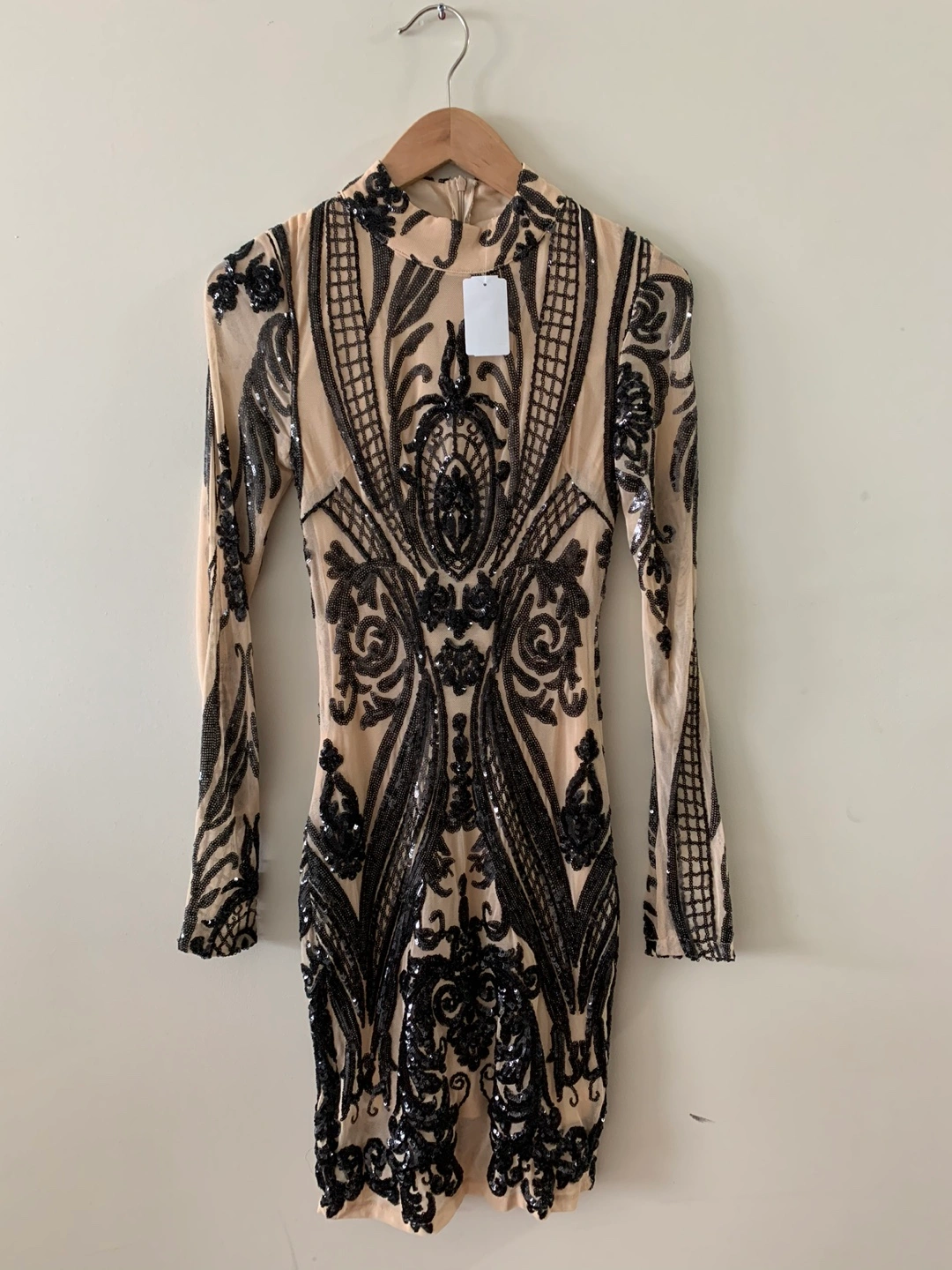 Long sleeve mini dress with black sequin embellishments on beige mesh. Mock neck.