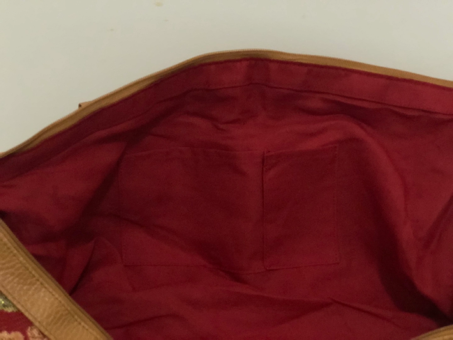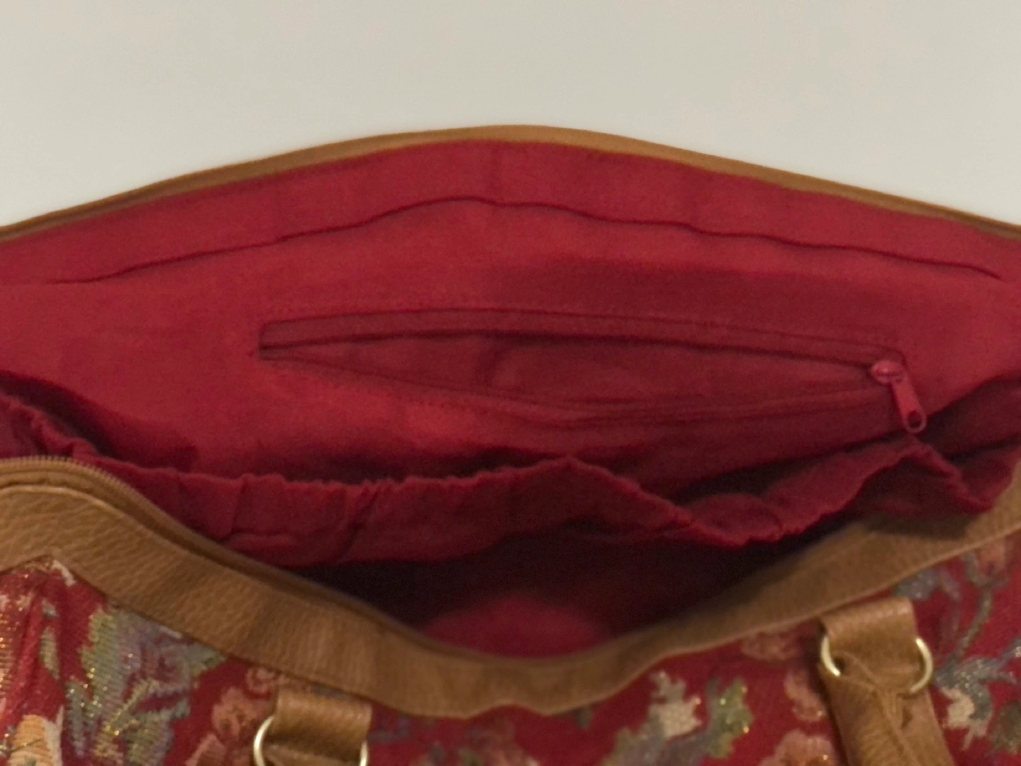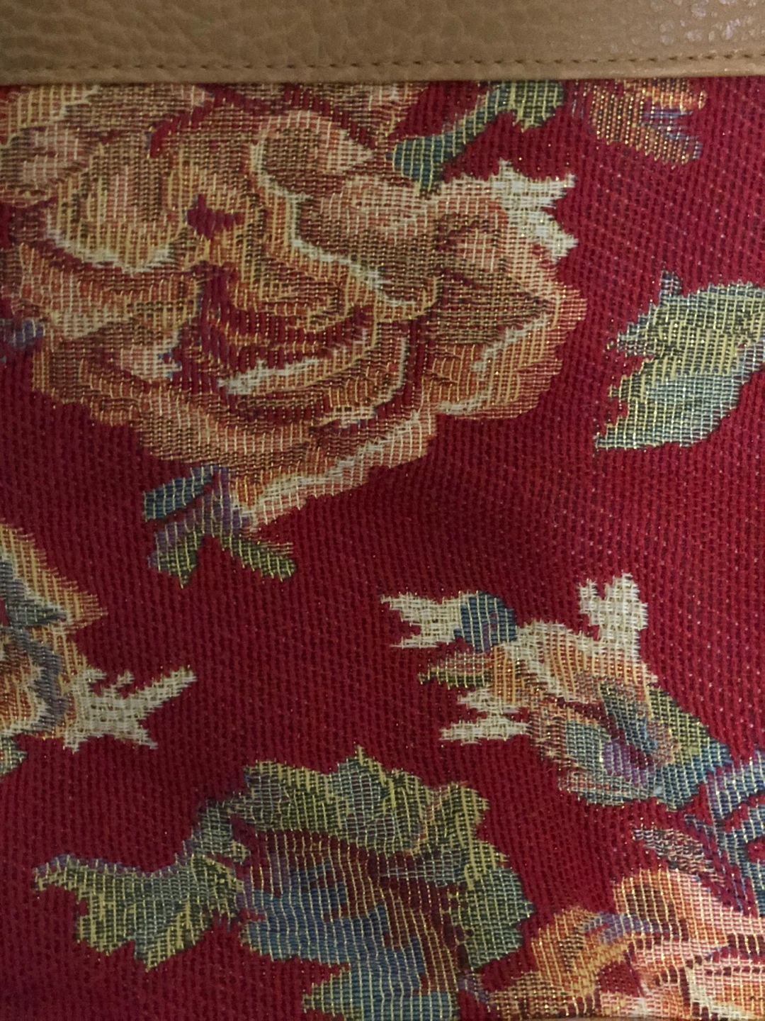 Vintage tapestry weekender bag with a floral pattern and brown leather accents. The bag has two top handles and an adjustable shoulder strap. Includes a large interior pocket and a zippered closure.