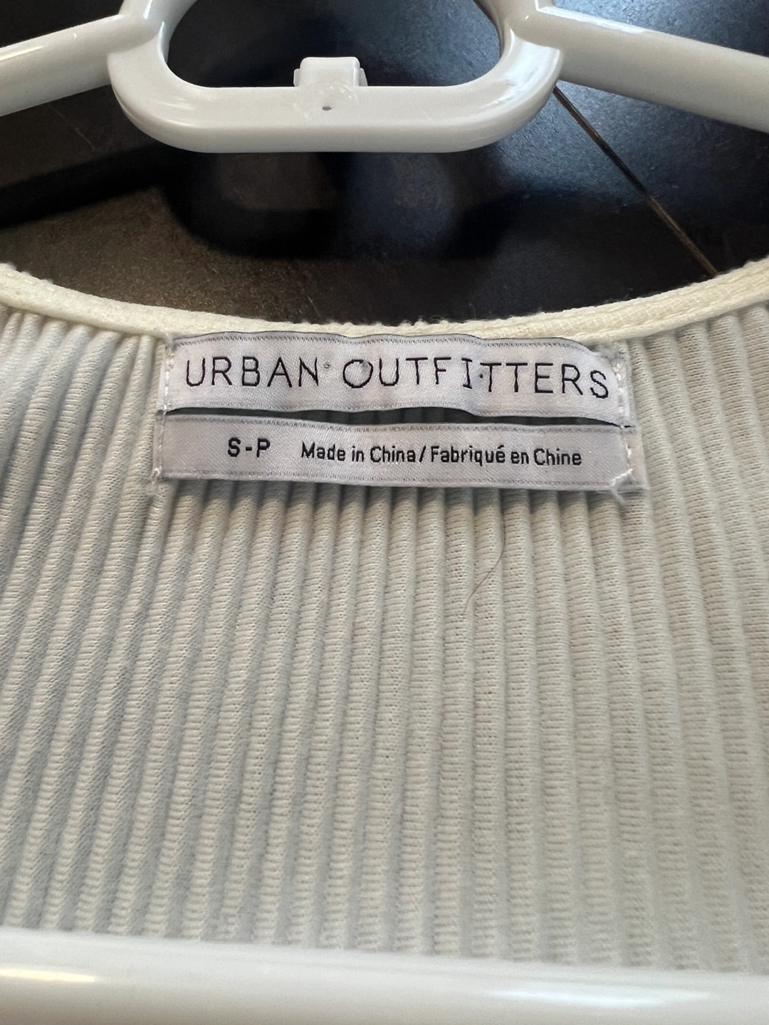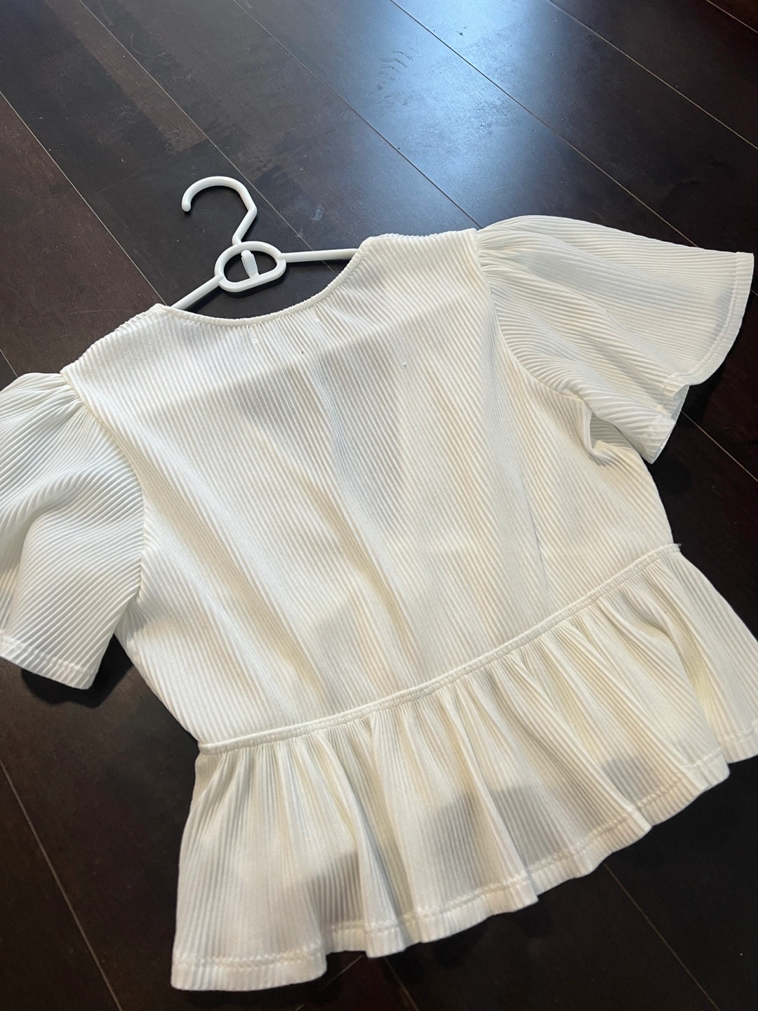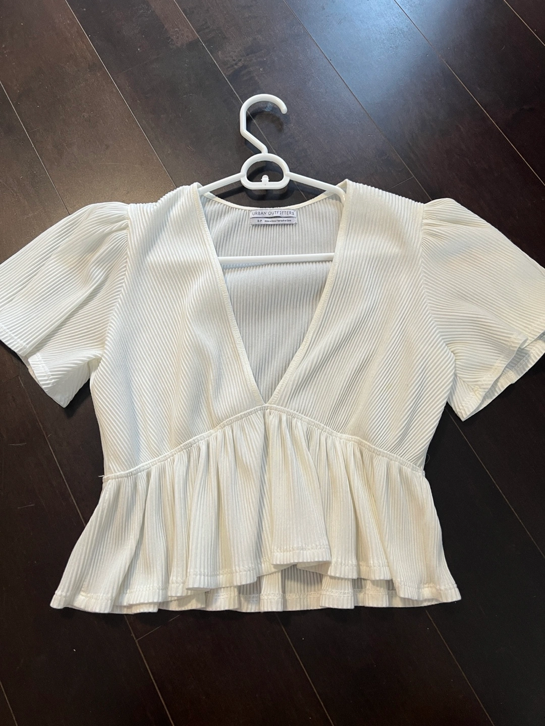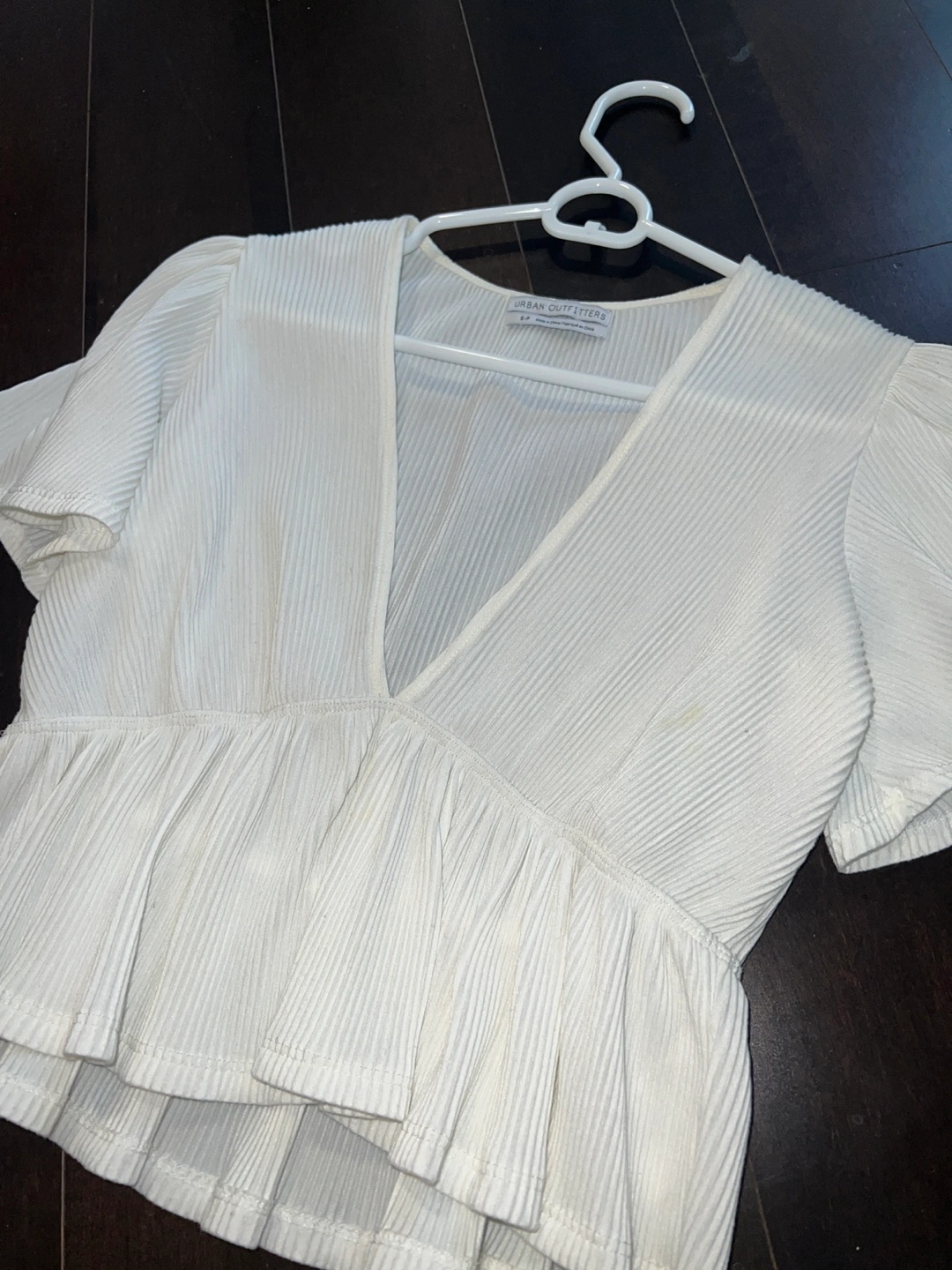 White ribbed crop top with a v-neck and short sleeves. The top has a ruffled hem. Size small runs big Pick up downtown