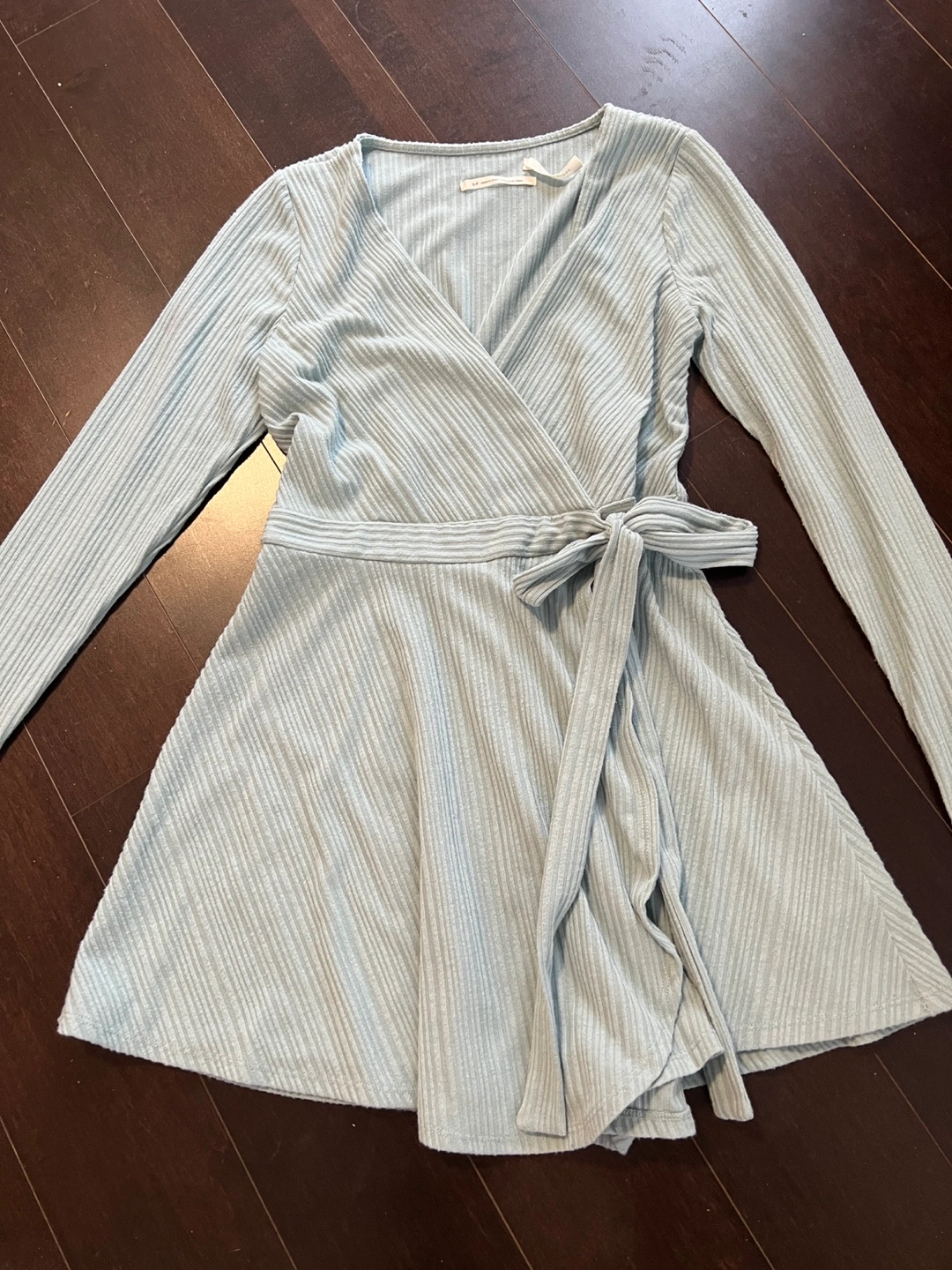 Long-sleeved, blue wrap dress with a tie waist. Ribbed material. With shorts like a romper Size small but it’s very stretchy Pick up downtown