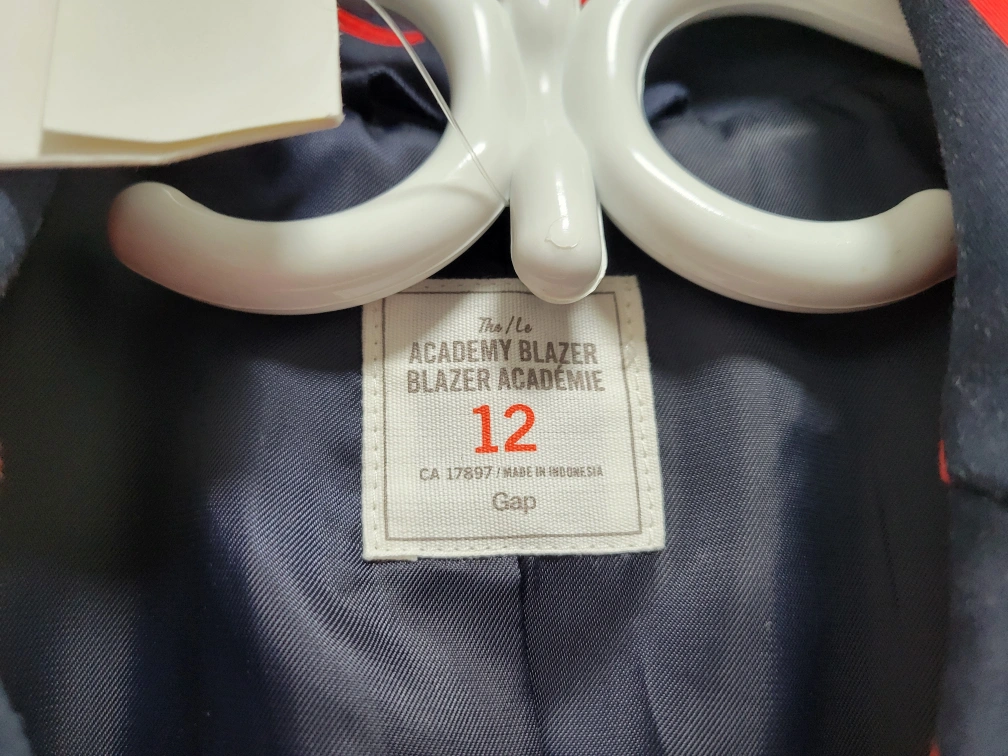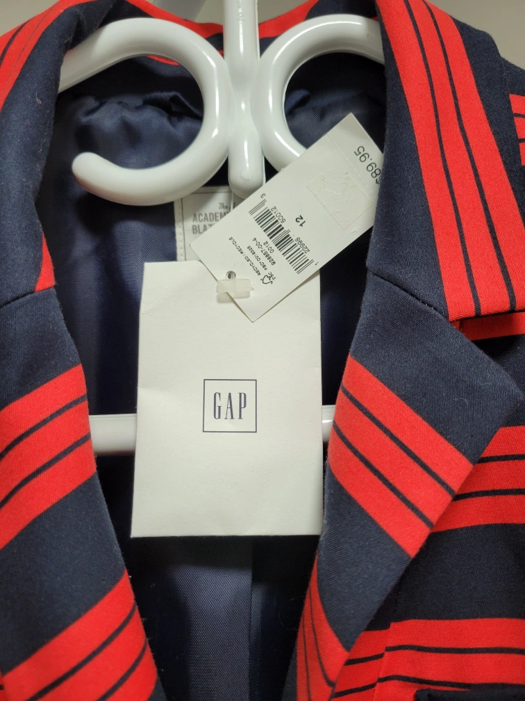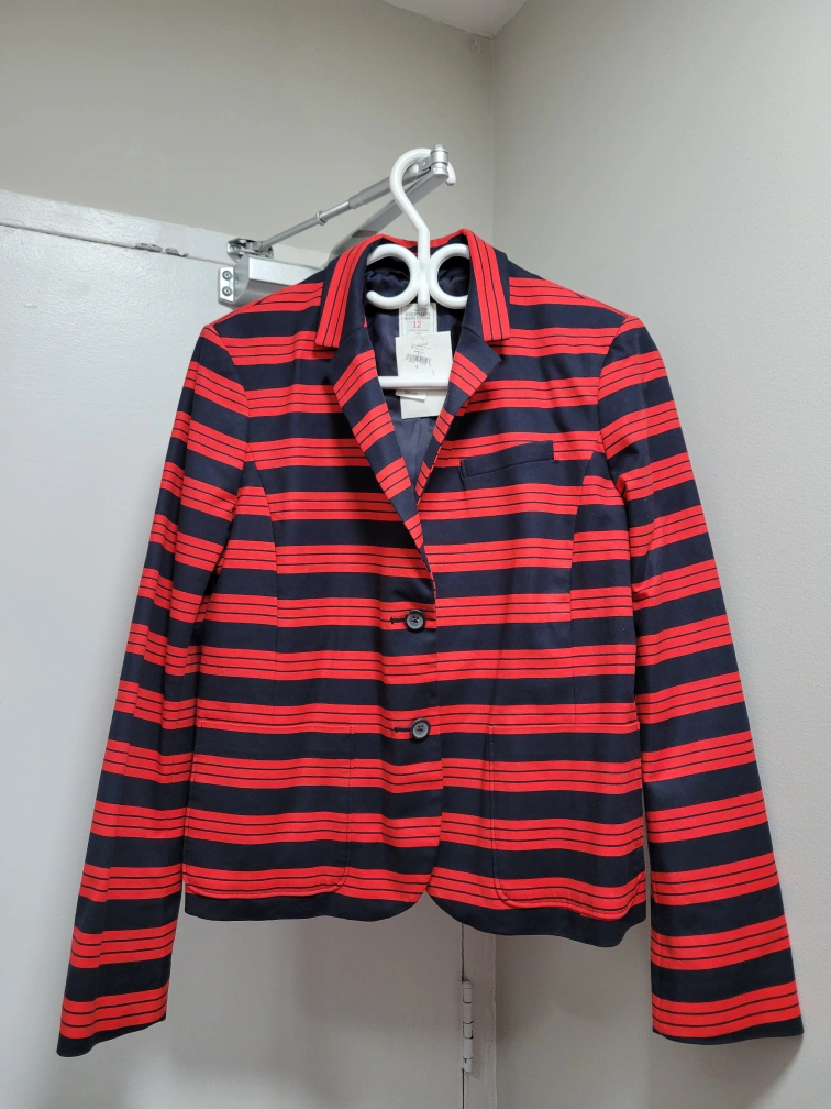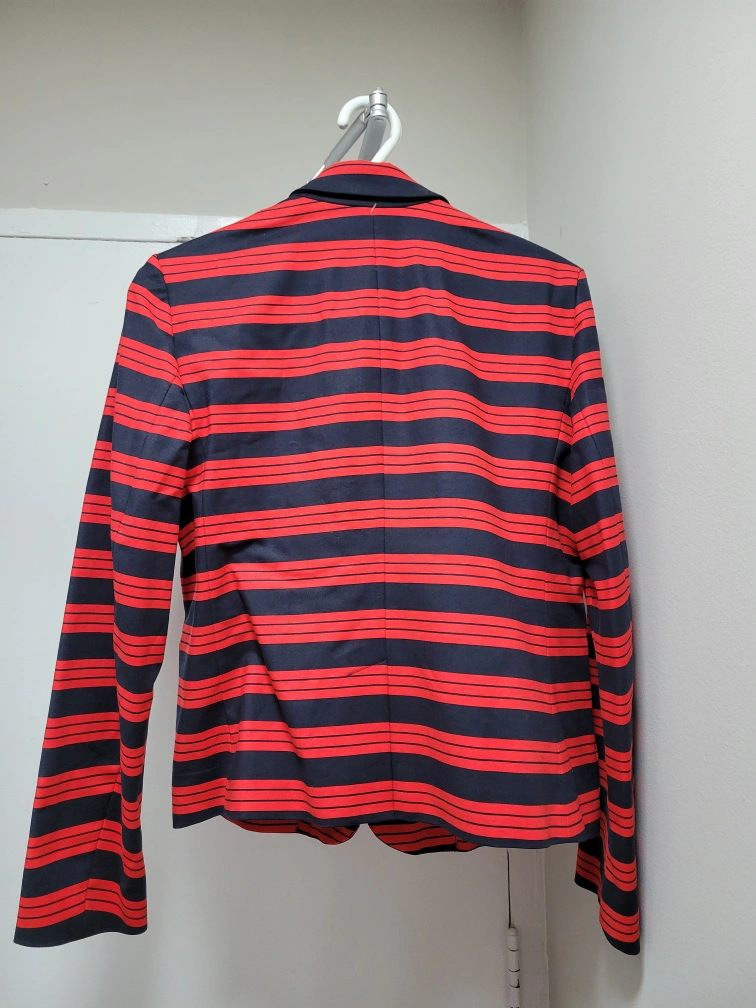 Red and dark blue striped blazer with two front pockets. Size 12. The blazer is lined and has a single button closure.