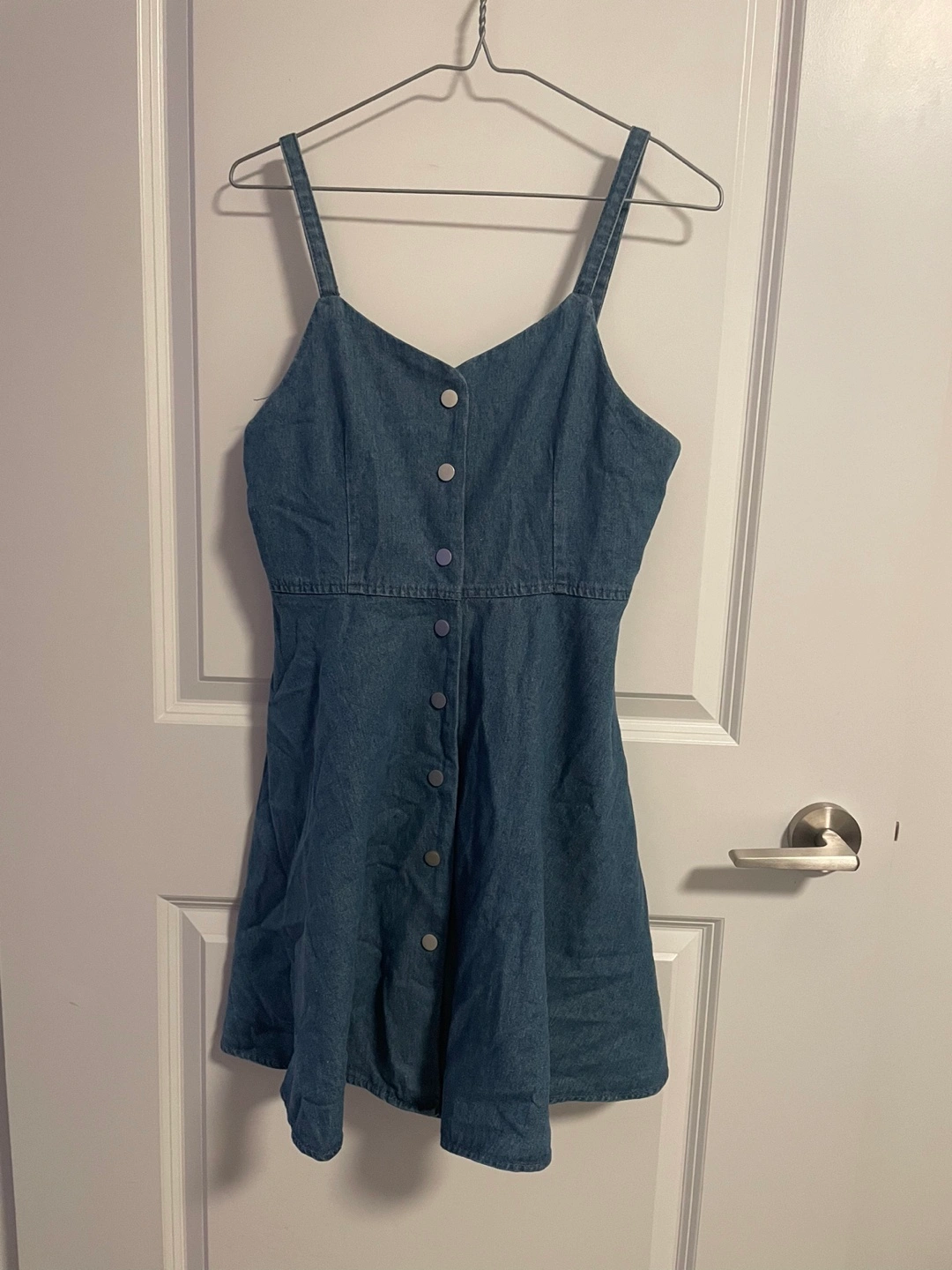 Blue denim dress with a button up front and thin straps. Flared skirt.