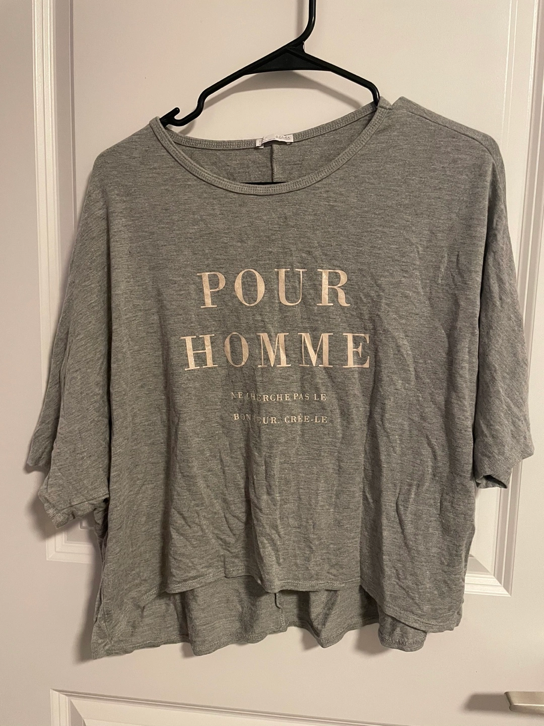 Grey T-shirt with a graphic print saying "Pour Homme" in white.