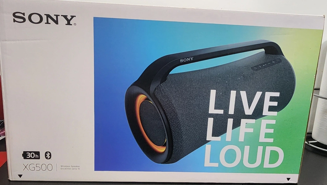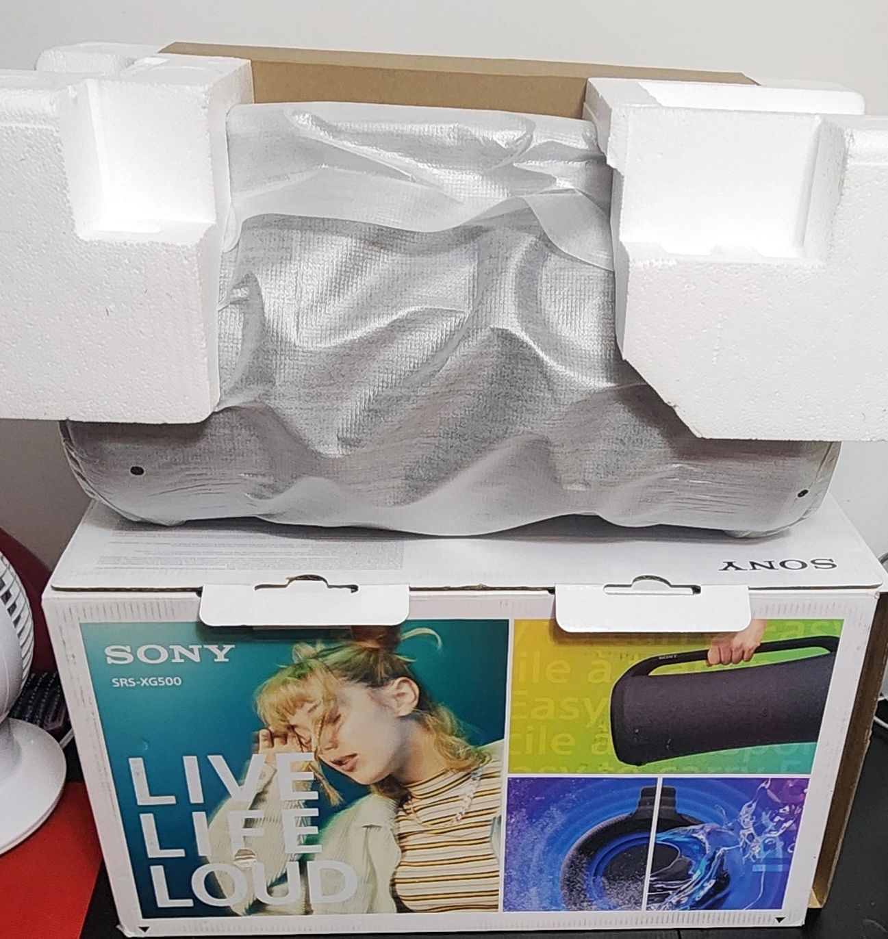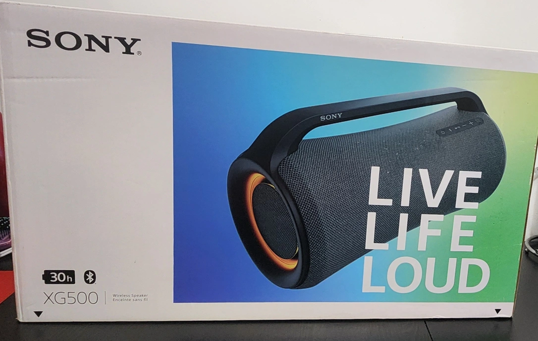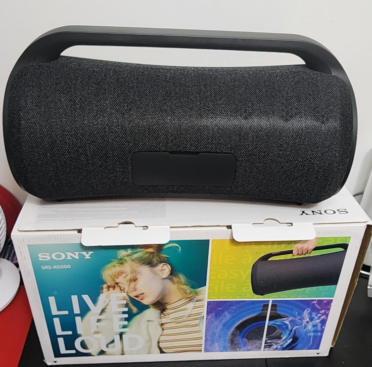 Black wireless Bluetooth speaker with a handle. In box, unused.