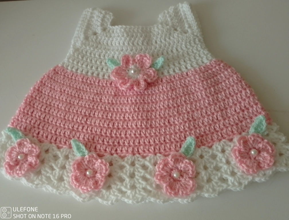 Pink and white crocheted baby dress with floral embellishments. Sleeveless and has a scalloped hem.