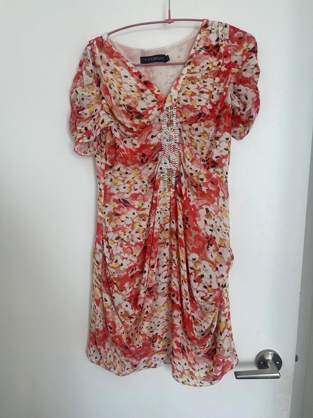 Short-sleeve, floral dress with beaded embellishment in the front. V-neck.