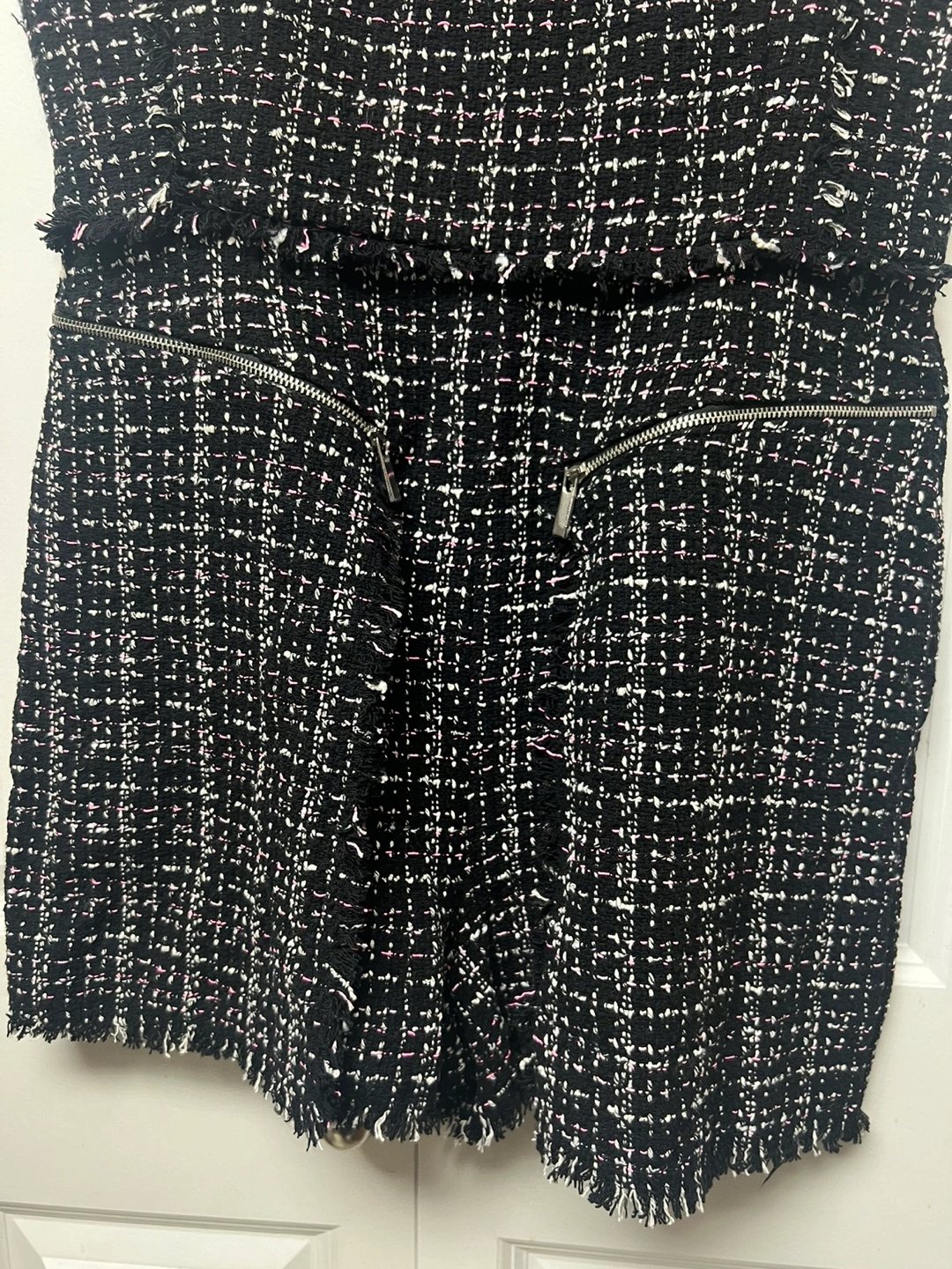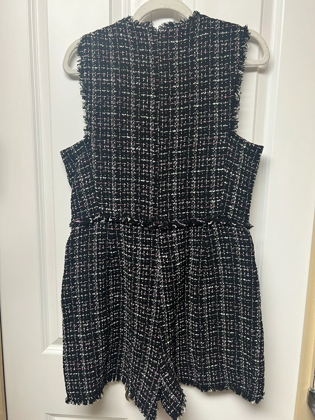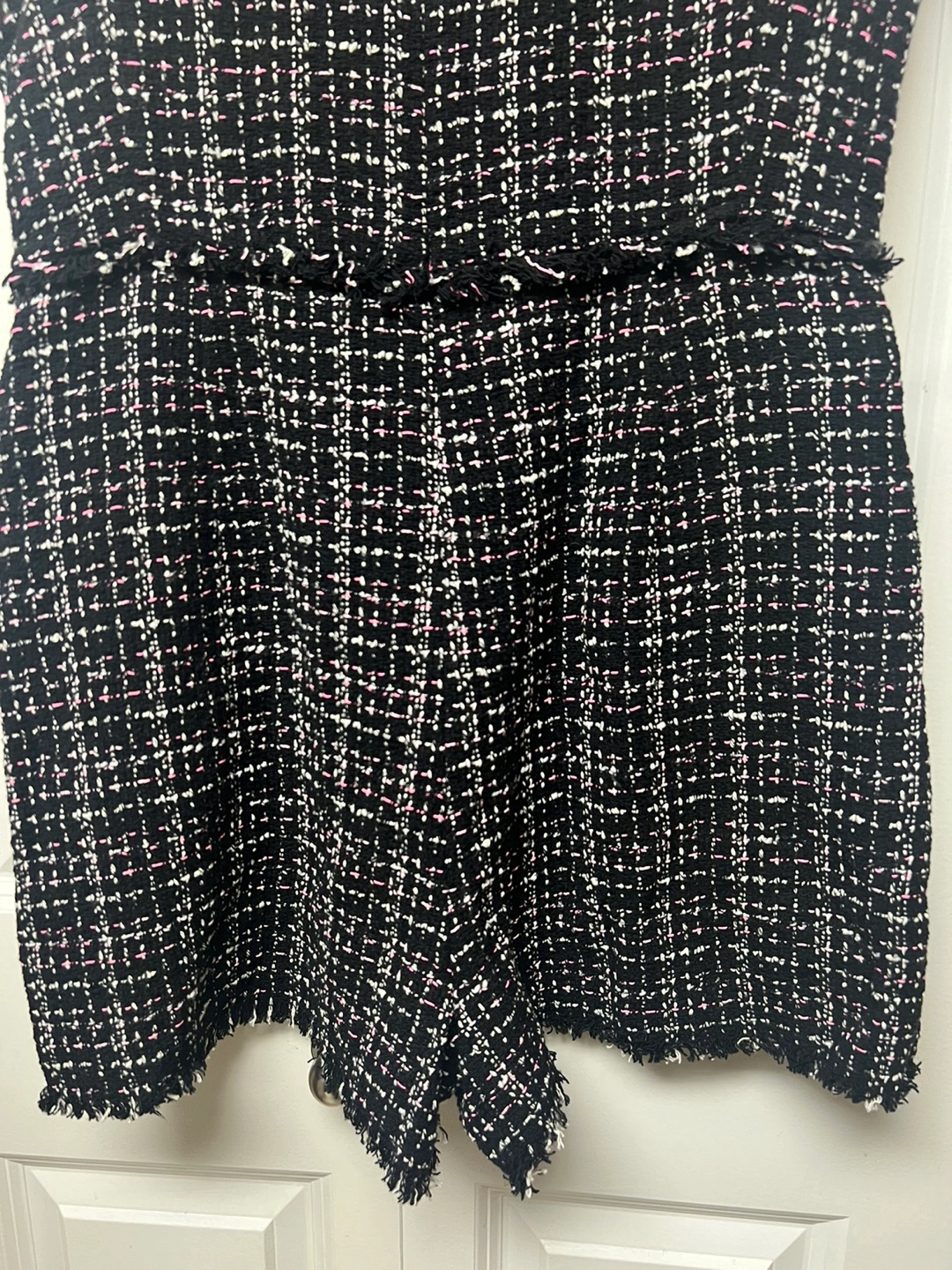 Black, white, and pink tweed jumpsuit with a sleeveless bodice and a fitted silhouette. Features a zipper closure and a frayed hem. Keeps in a Smoke, Pets free house Cash only and pick up at Port Coquitlam