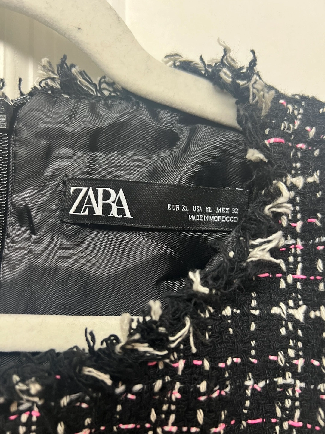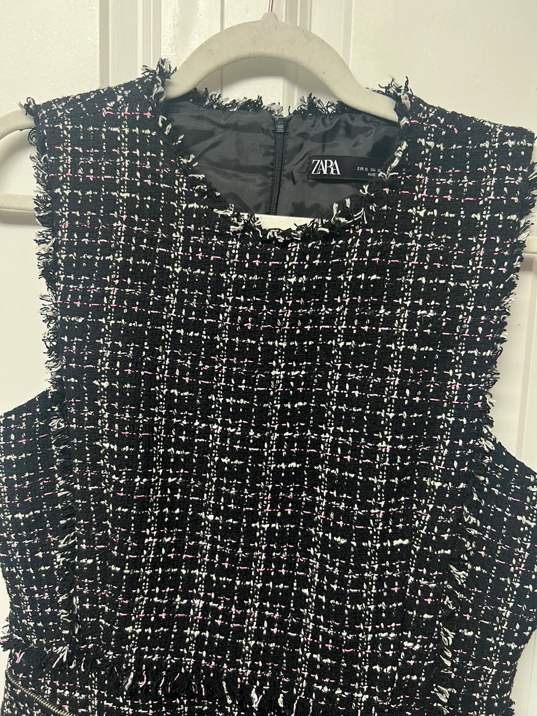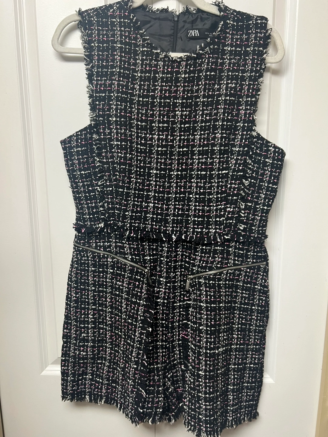 Black, white, and pink tweed jumpsuit with a sleeveless bodice and a fitted silhouette. Features a zipper closure and a frayed hem. Keeps in a Smoke, Pets free house Cash only and pick up at Port Coquitlam