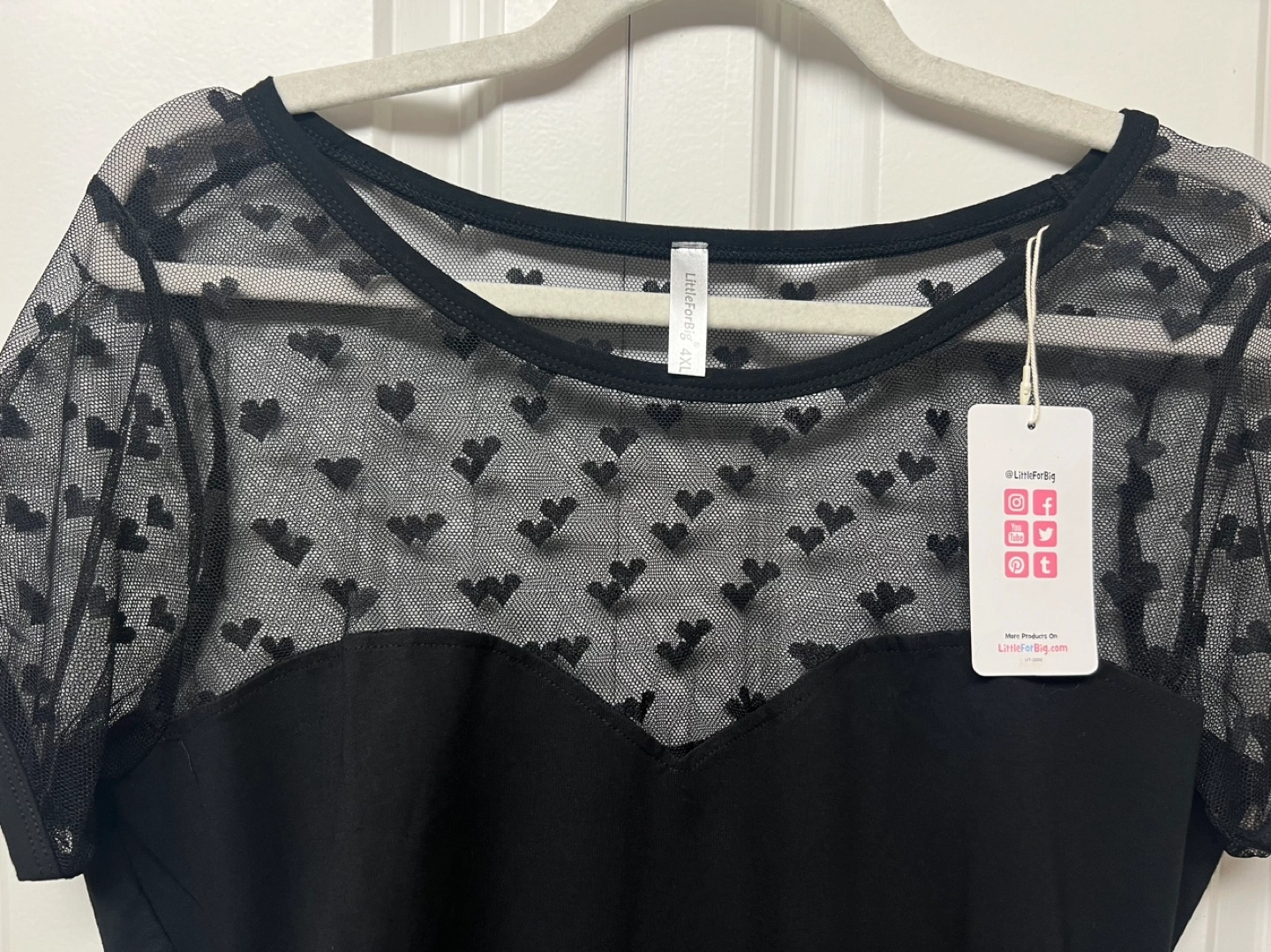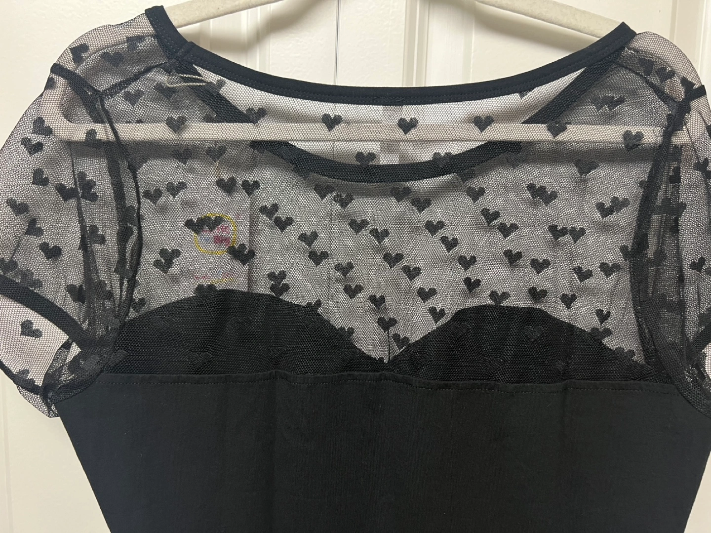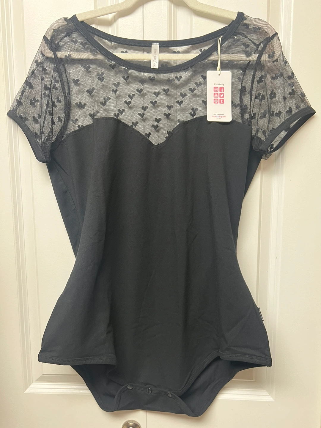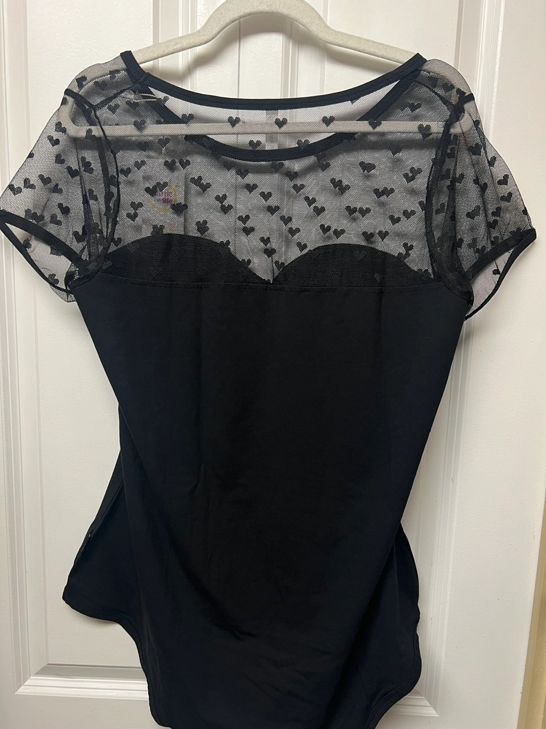 Black Romper Pajamas bodysuit with short sleeves and a sheer mesh panel with heart details. Has a scoop neck and snap closure at the bottom. Cash only and pick up at Port Coquitlam