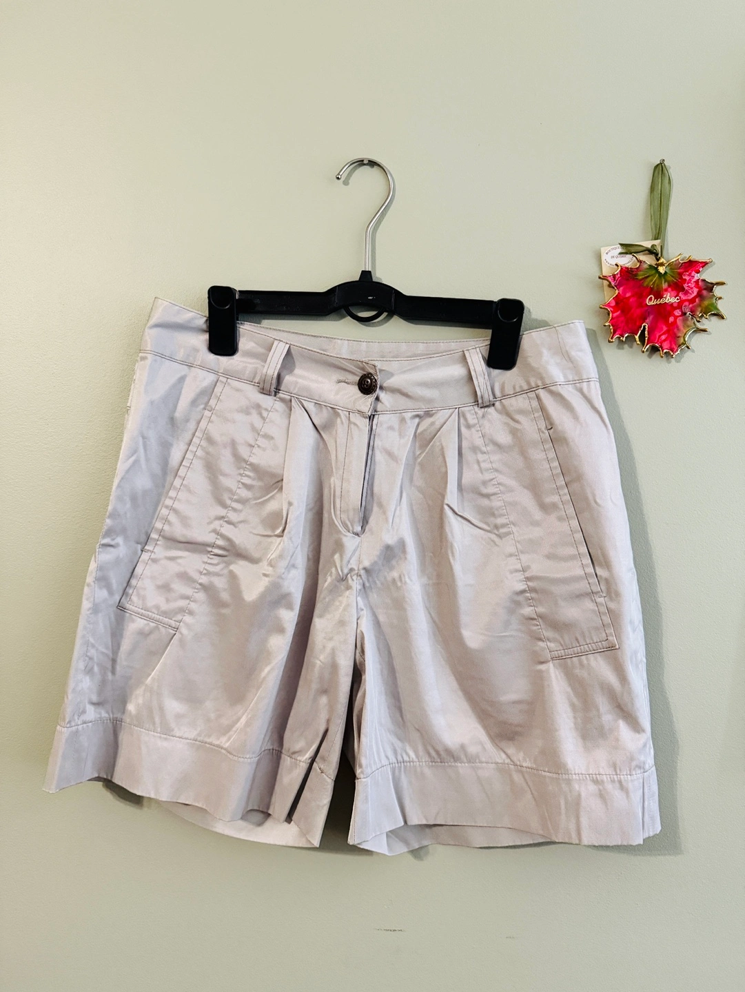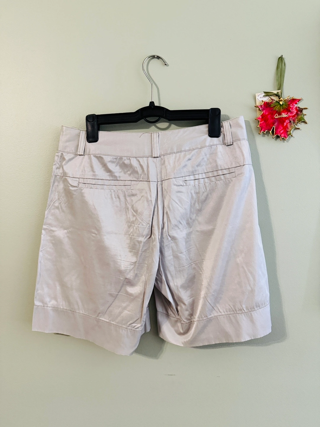 Light grey, casual shorts. Two front pockets. Back pockets. Belt loops.