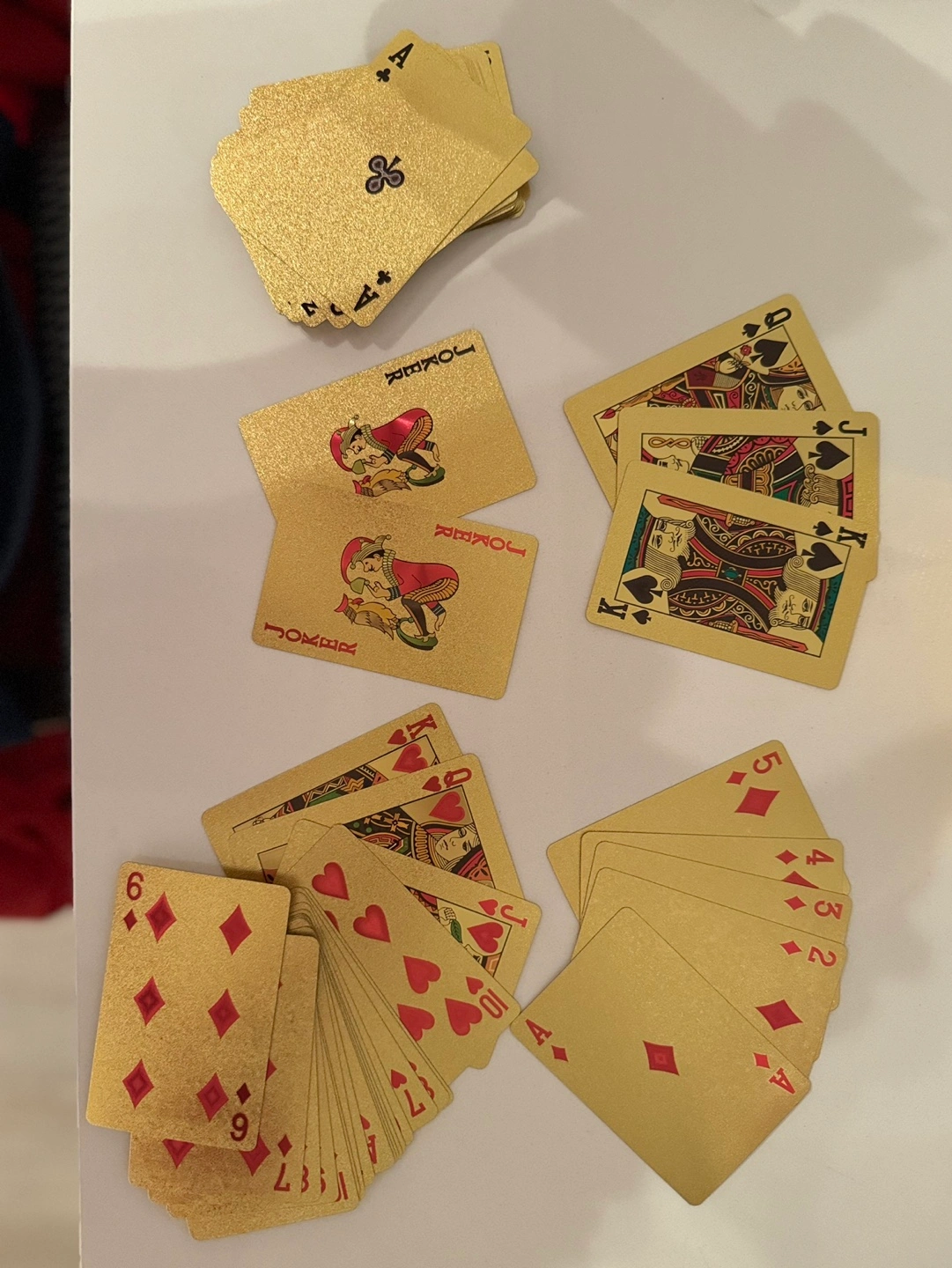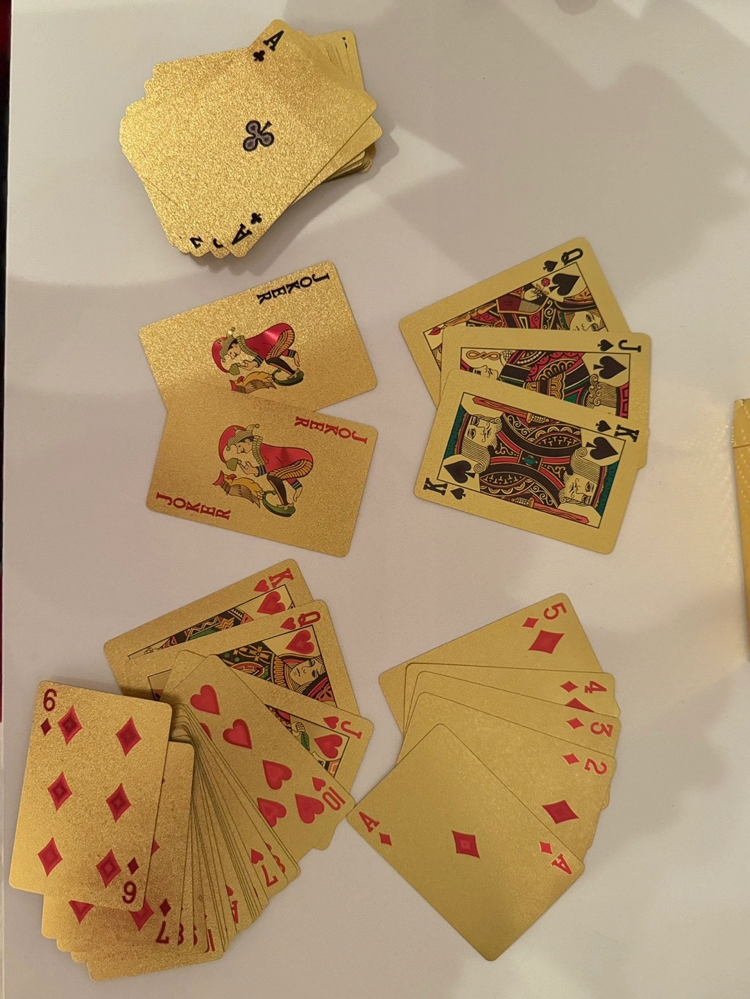 ‘Gold-plated’ playing cards purchased in Switzerland. Note: they are made of a very shiny, gold like carton paper. Lightweight but look like metal. Never used, comes with the original box. Originally paid $40 CHF (approx $64 cad)