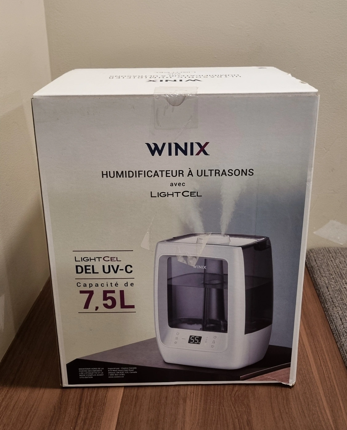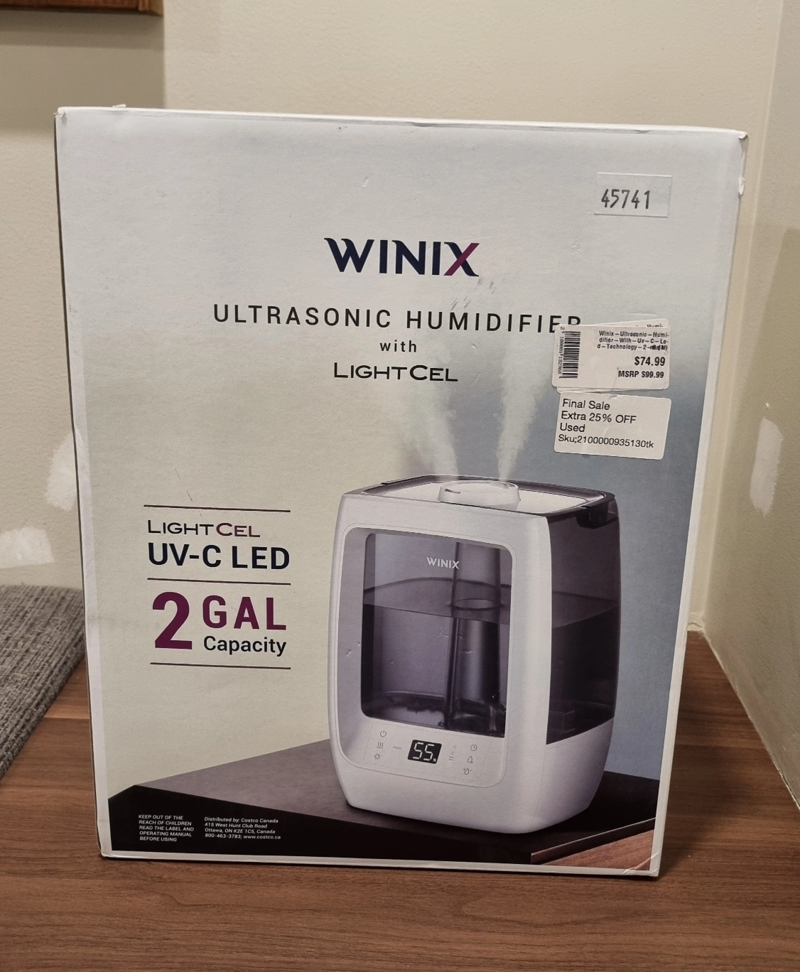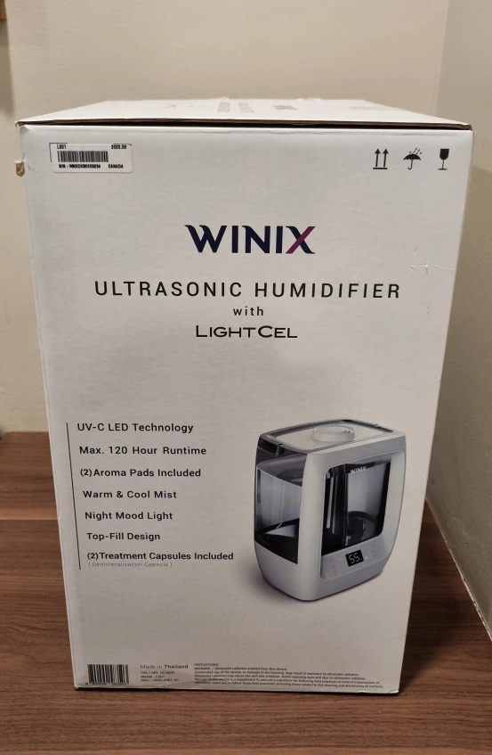 Ultrasonic humidifier with LightCel technology. 2 gallon capacity. Includes 2 aroma pads, night mood light and 2 treatment capsules. Top fill design.