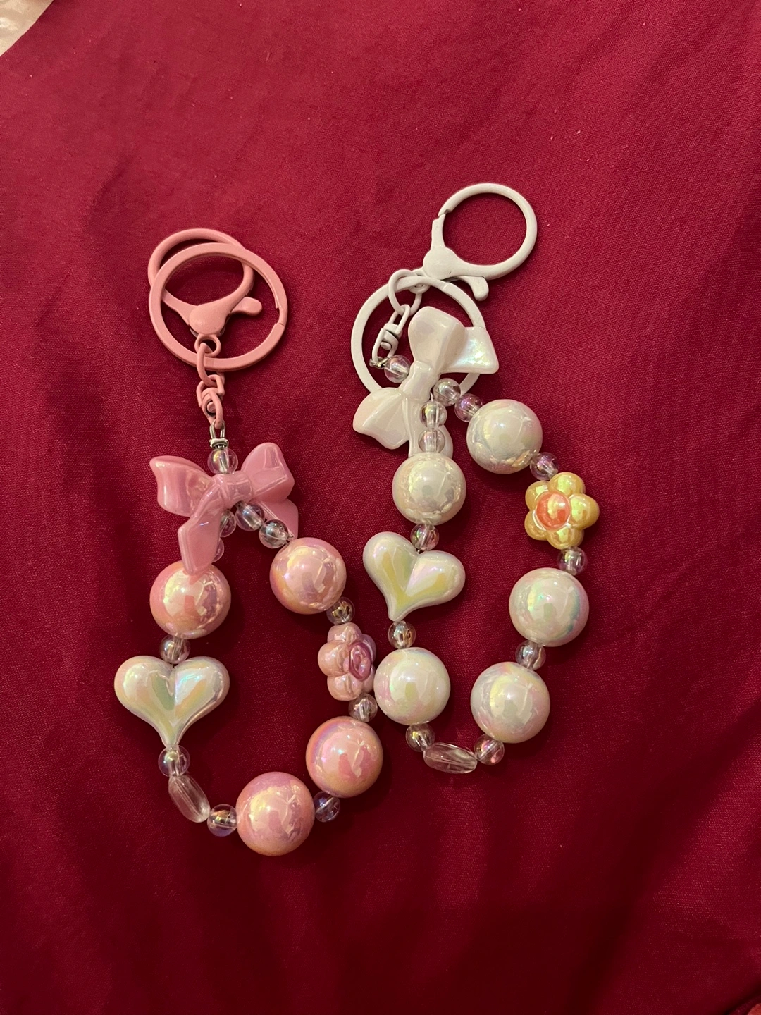 Pink and white beaded keychain with bow and heart charms. Perfect for phones and keys Colorful chain $5