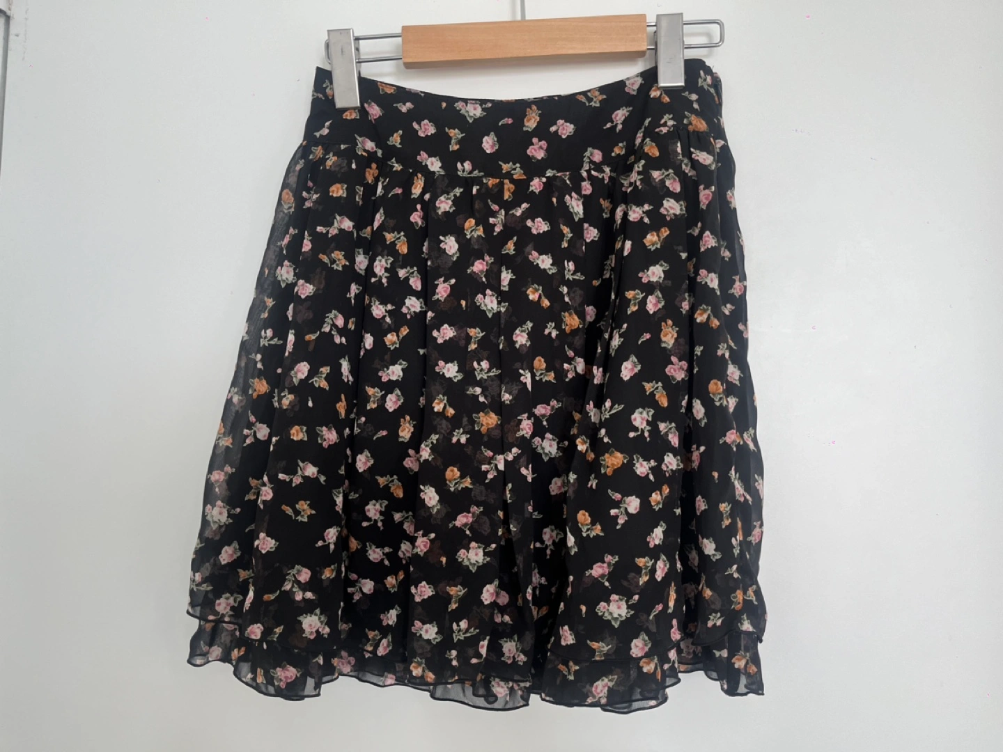 Black skirt with floral print. A-line with ruffle hem. Sheer fabric.