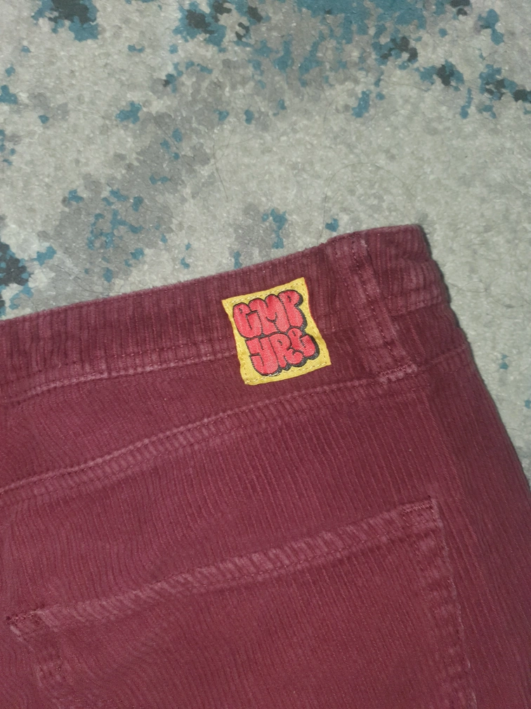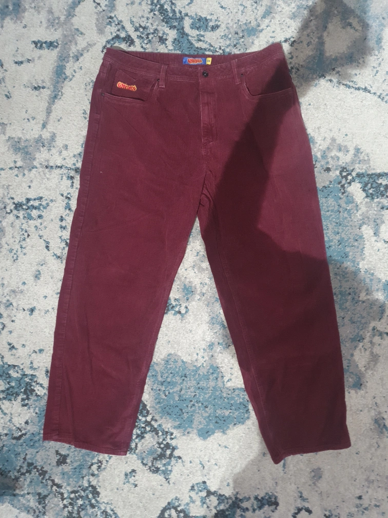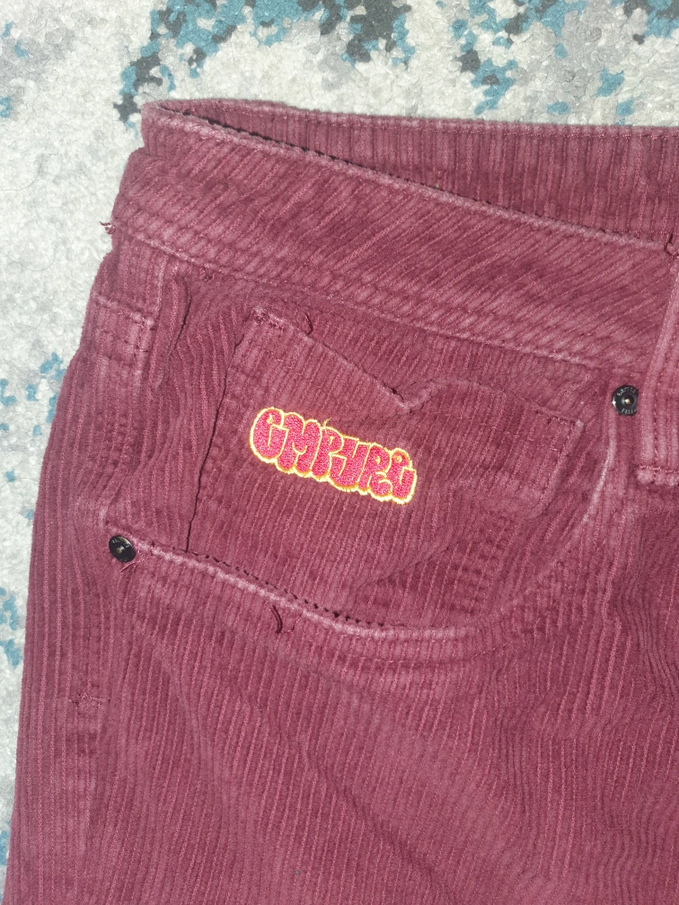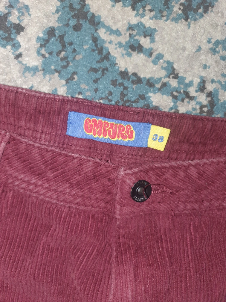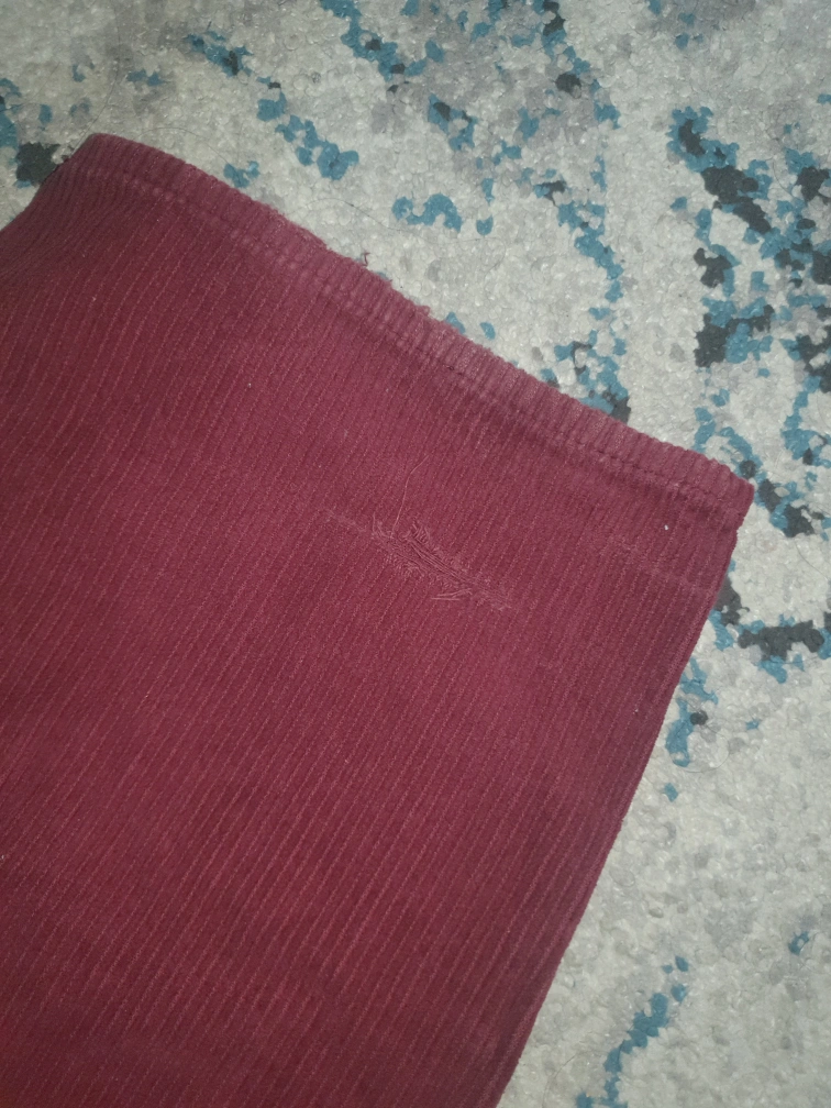 Size 38, burgundy, corduroy pants. Five pockets. a little torn on the bottom and got originally for 85$.