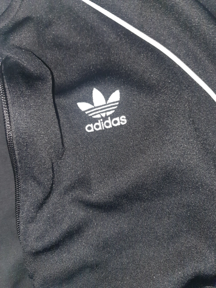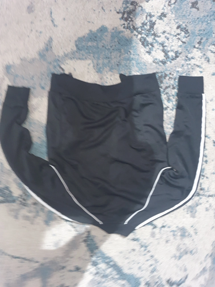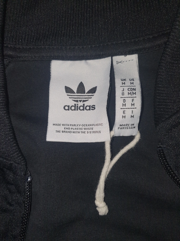 Black track jacket with white stripes. Zip up front. Size Medium. Made with Parley Ocean Plastic.