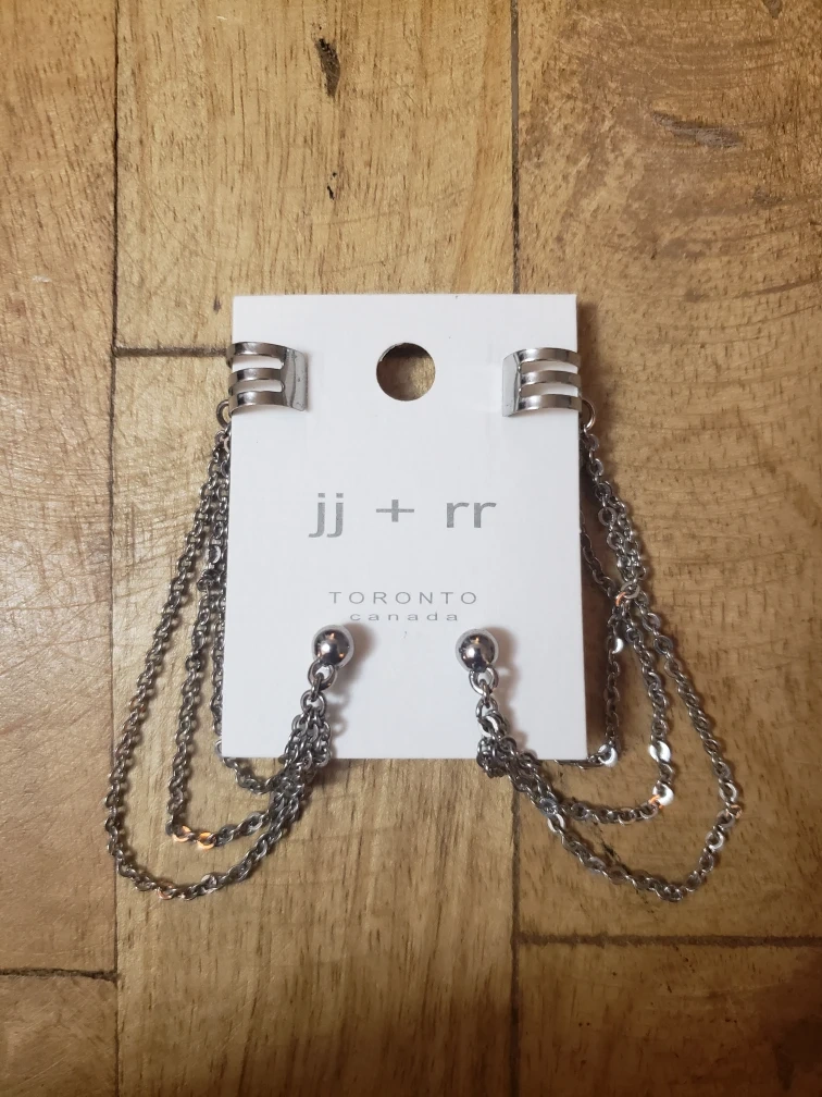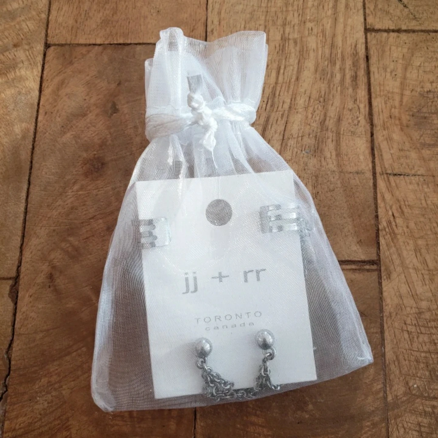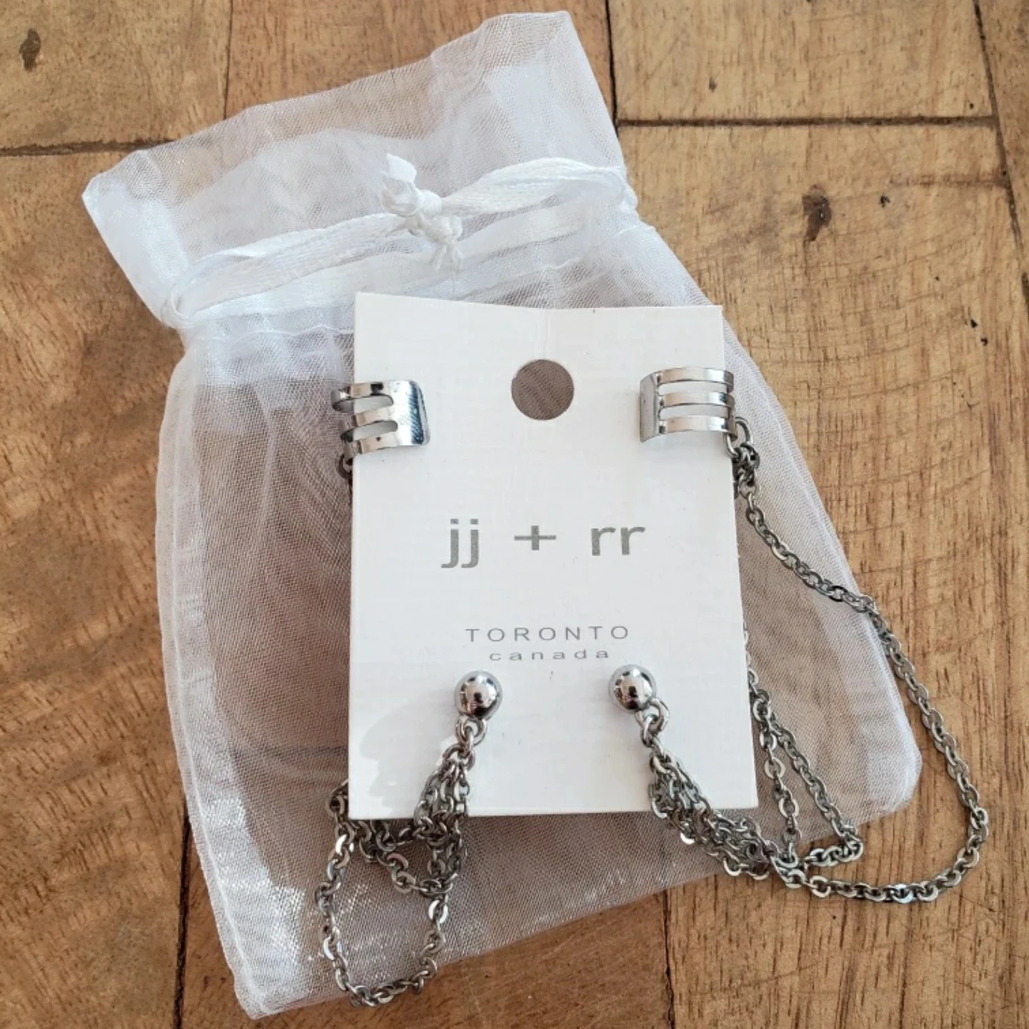 Silver ball stud earrings with chain attached ear cuffs. 3 chains on each side. White organza baggie included for gifting.
