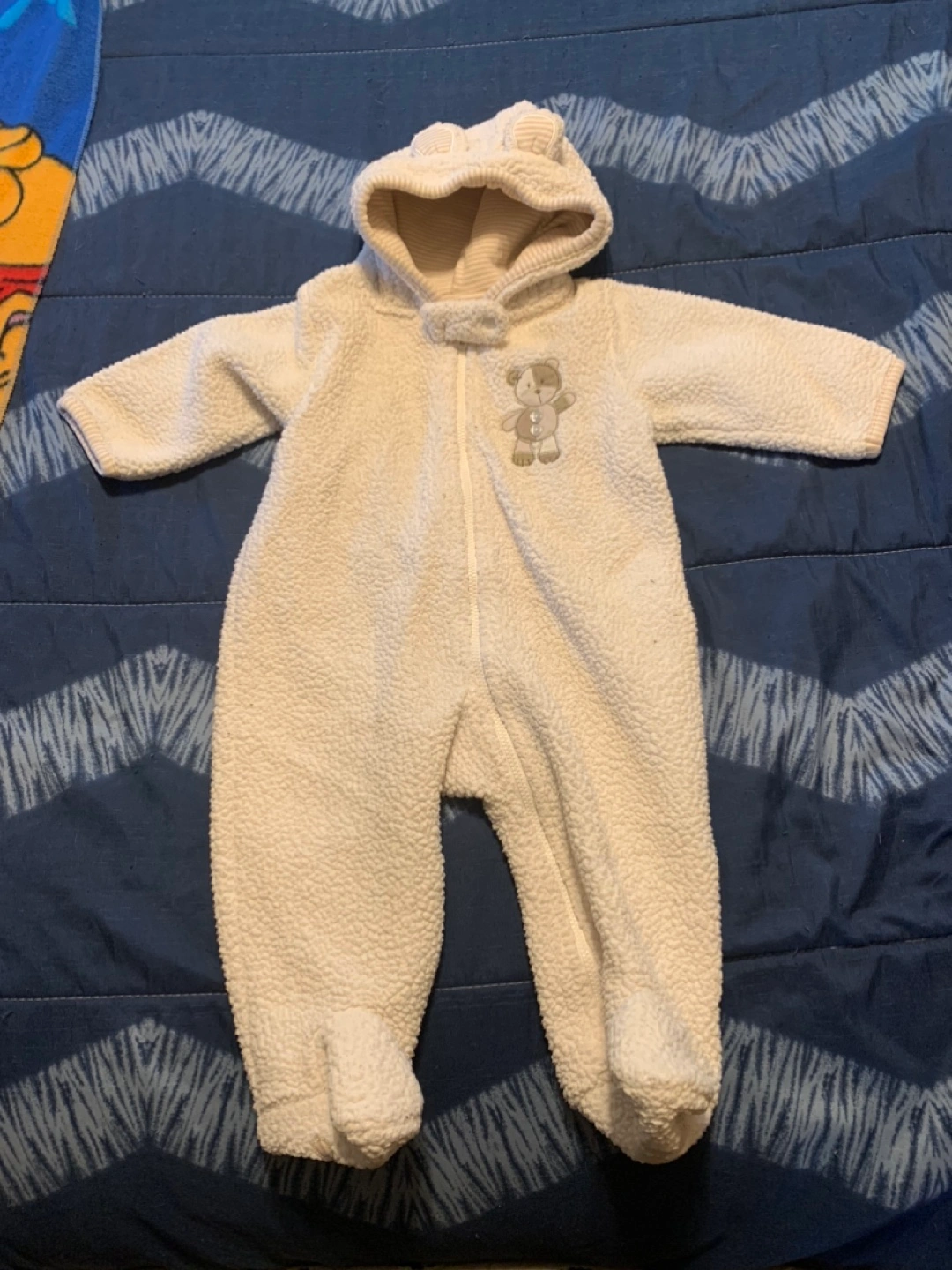 White teddy bear suit with a hood. Zipper closure.