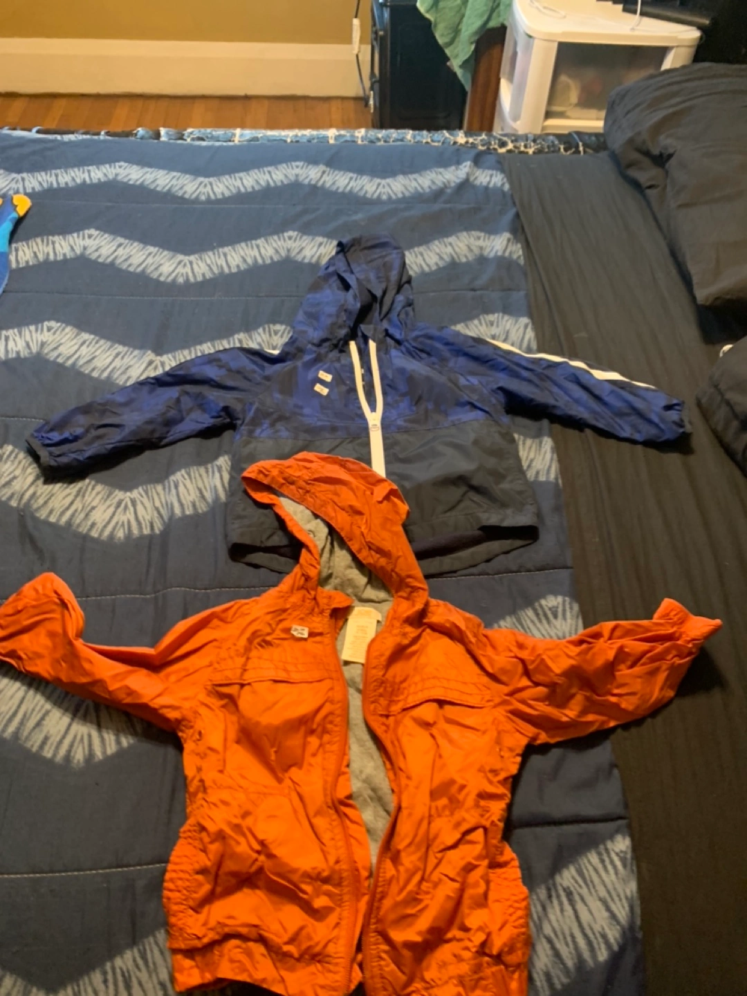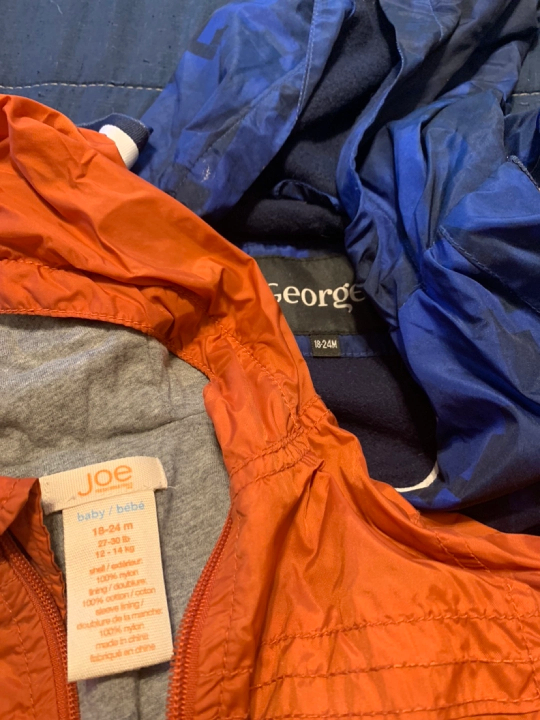 Two boys' rain jackets. One blue with white stripes and the other is orange. Both have hoods. One is labelled George and the other Joe. 18-24 Months. $20 EACH.