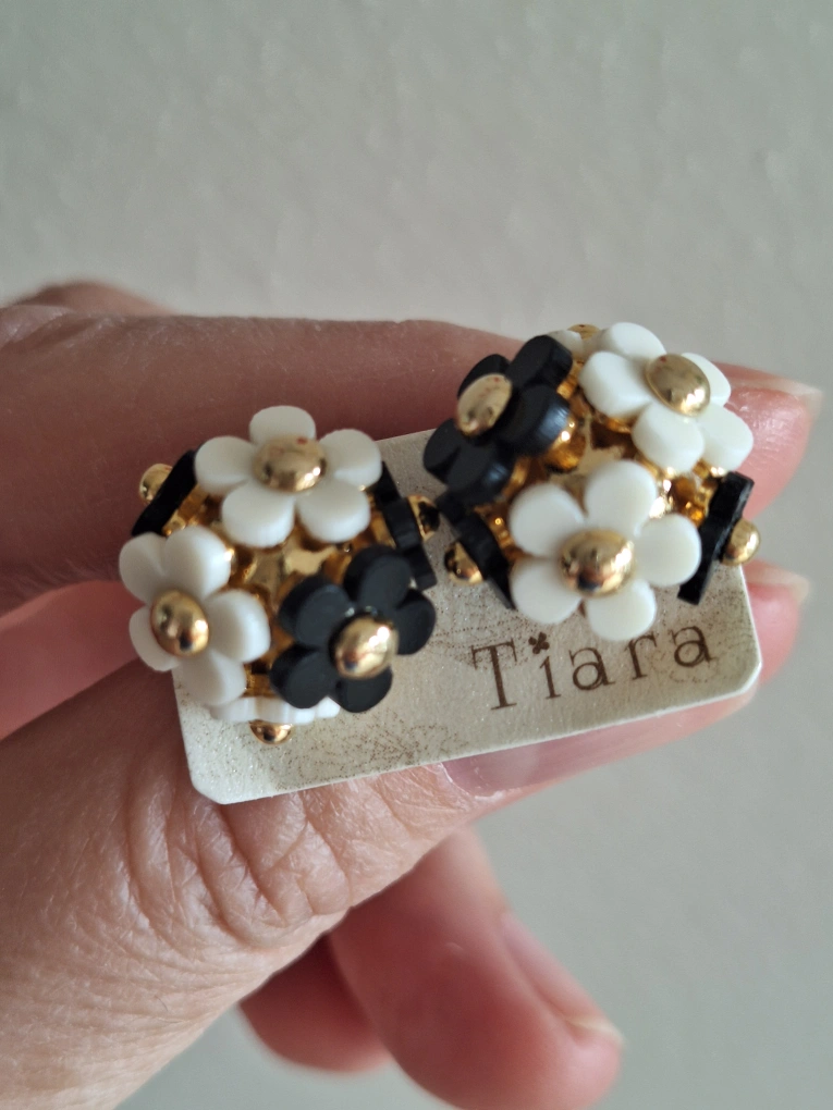 Beautiful Black and white flower stud earrings. Gold-tone metal. Brand New, never worn. Cash Only, pick up at Fairview Mall T&T S upermarket