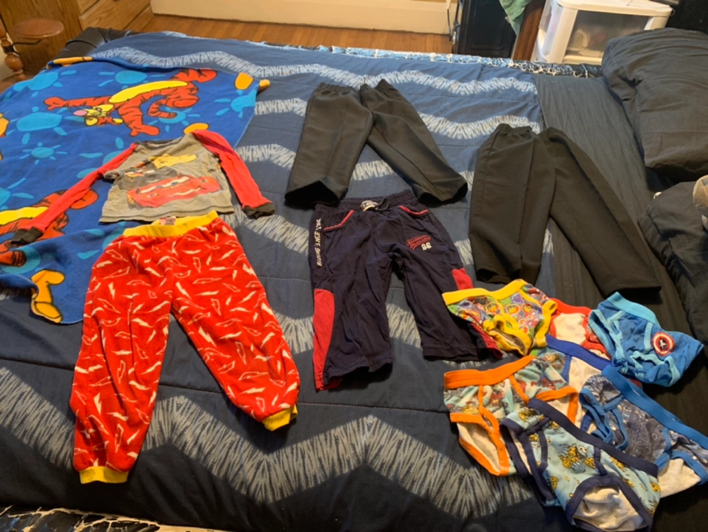 Different clothing. 6 pairs of underwear $5 Cars Pyjamas $5 Dress Pants $5 each Pants $5 Would love to sell all at once. Take all for $20