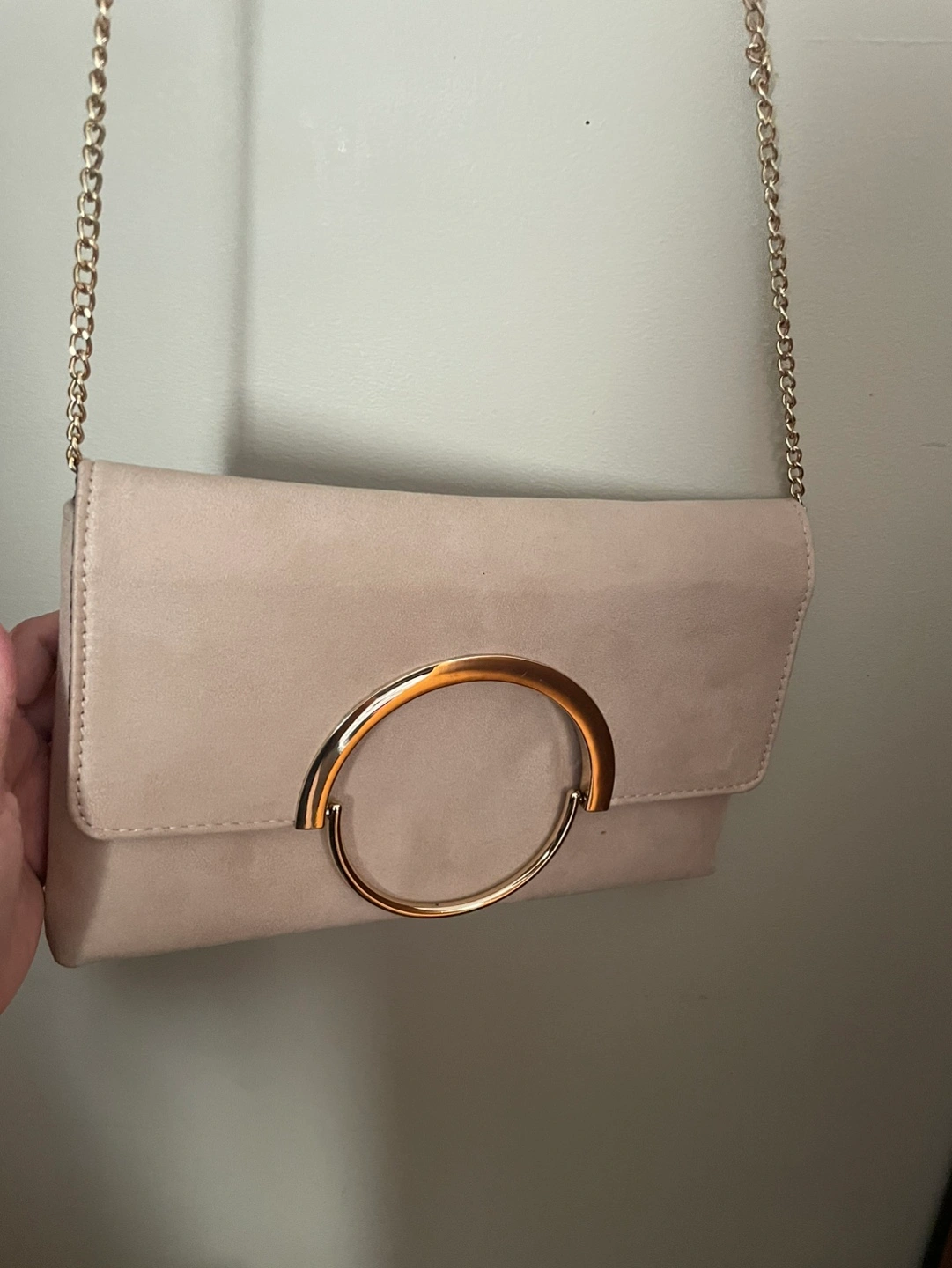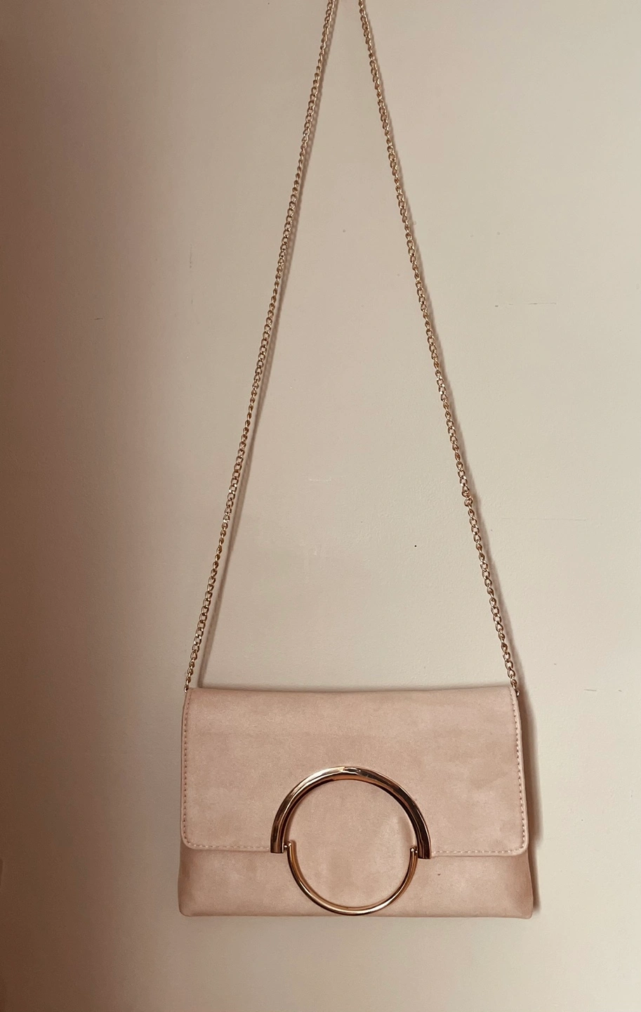 Call It Spring Suede clutch with gold chain and ring detail. 📌Nice color pastel palette Works well with any outfit esp dark color dresses 📌It has this luxury brand feel 📌Can be a purse when travelling 📌Magnetic & button closure With inside pocket I really love this for events as I did some pt hosting or catering side job before. This is still in good condition. Inside is clean to just place my phone & organizer inside Pu Whitehorn ne Cash or emt