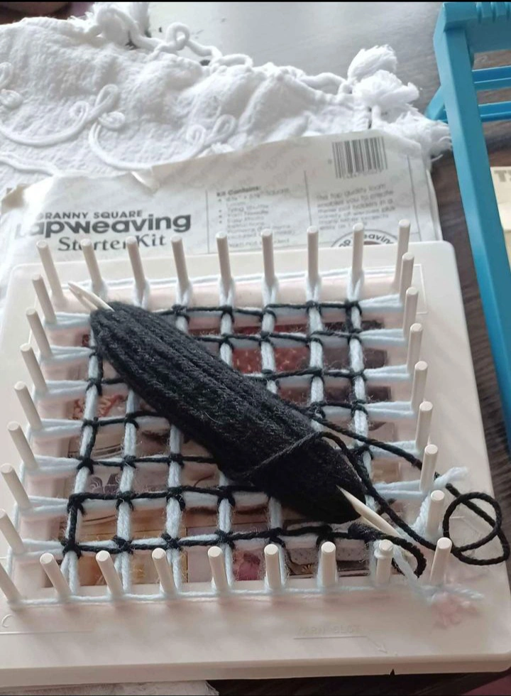 Lap weaving kit. Includes loom, yarn needle, tying shuttle, instructions.