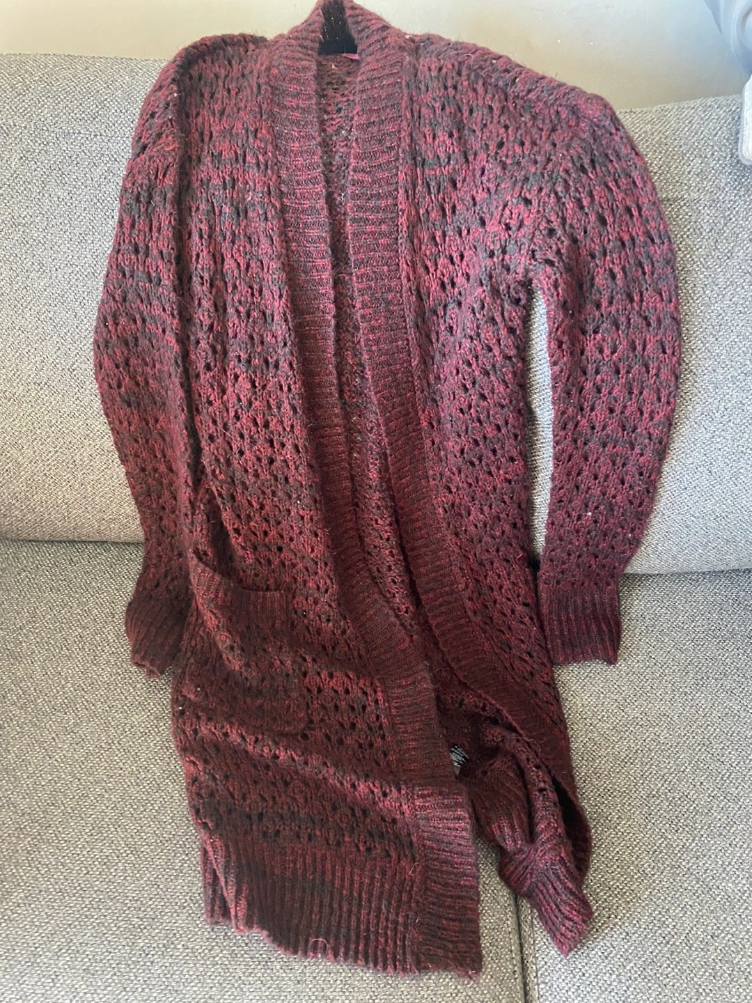Long-sleeved cardigan with open front and pockets. Red burgundy black knit with open knit design.