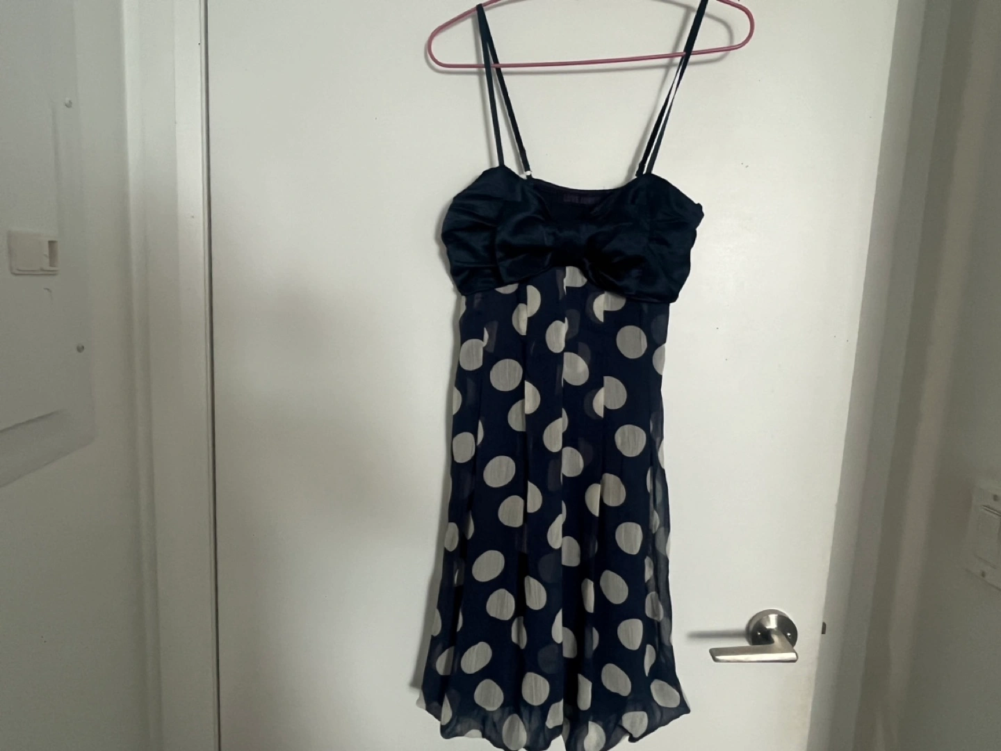 Strapless dress with a large bow on the bust and polka dots. Made of a chiffon material.