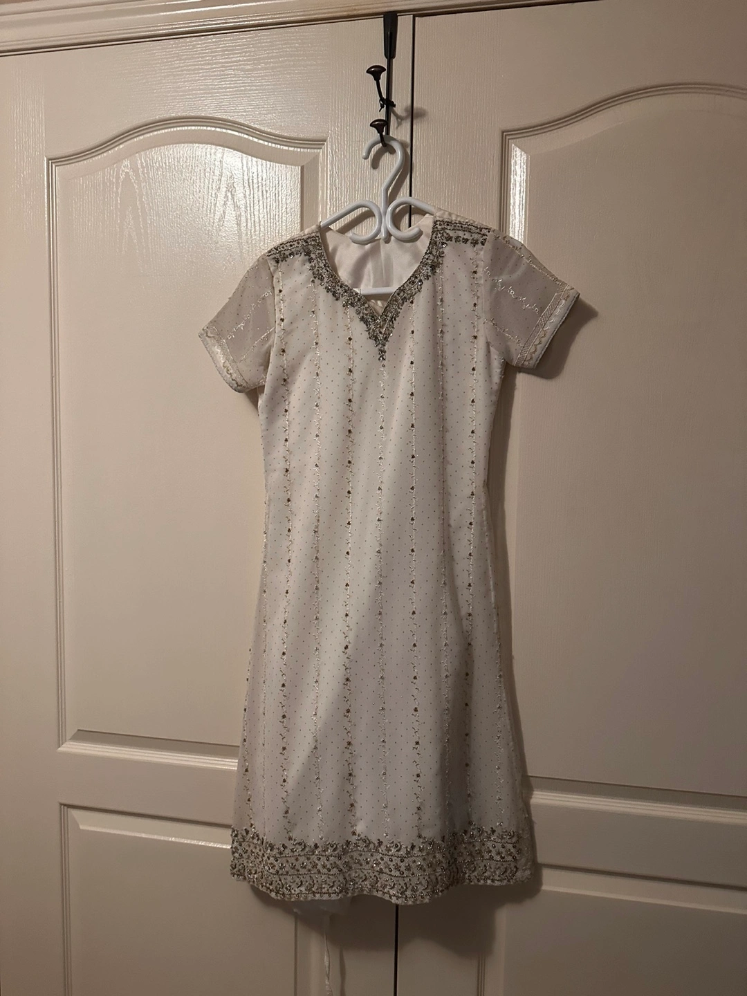 White embroidered kurta with short sleeves and a V-neckline. Features a beaded design and is made of a sheer fabric. Pickup in Markham - Markham Rd & 16th Avenue. Smoke free, pet free environment.