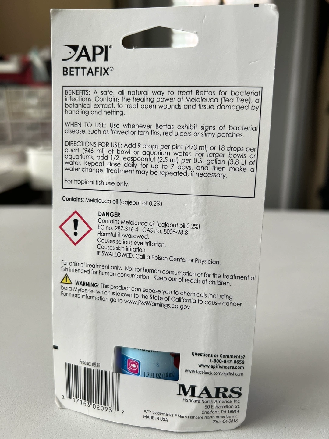 1.7fl oz (50ml)bottle of Bettafix. Treats bacterial infections, safe to treat open wounds and tissue damaged by handling and netting. For bettas, red-tail or slimy patches, when fins are frayed. Never been opened Cash only and pick up at Port Coquitlam