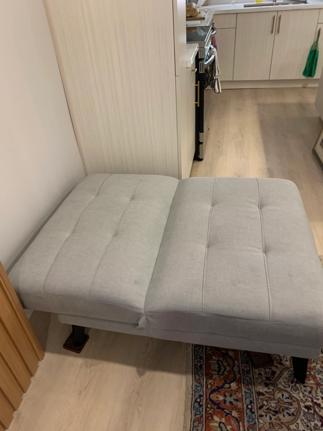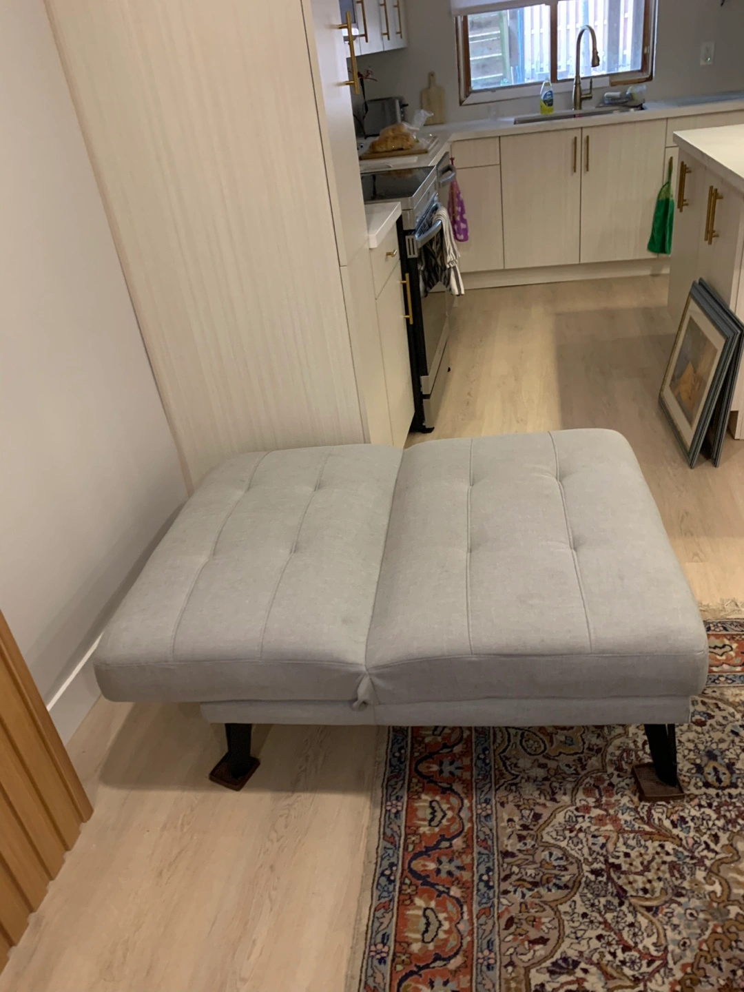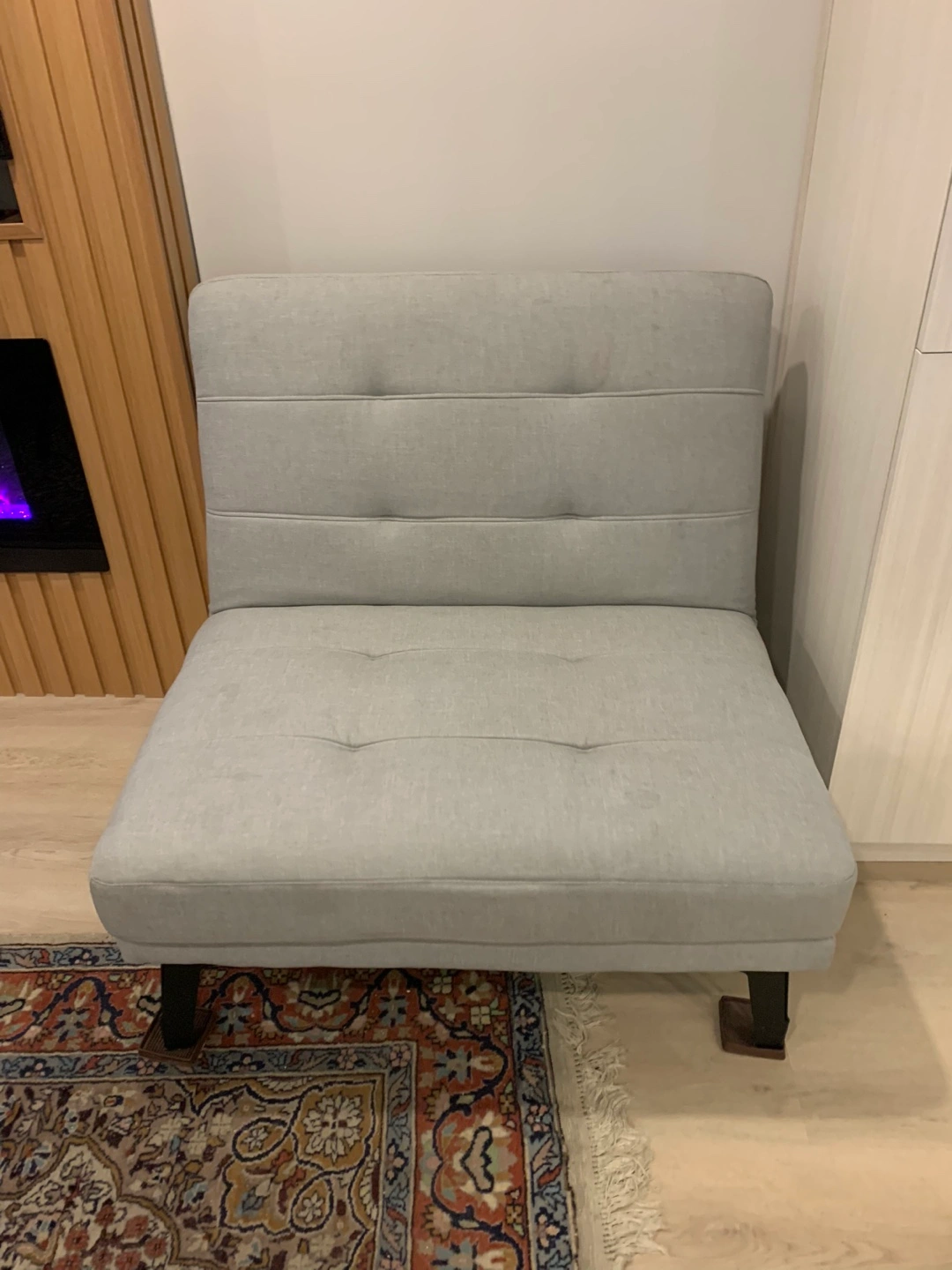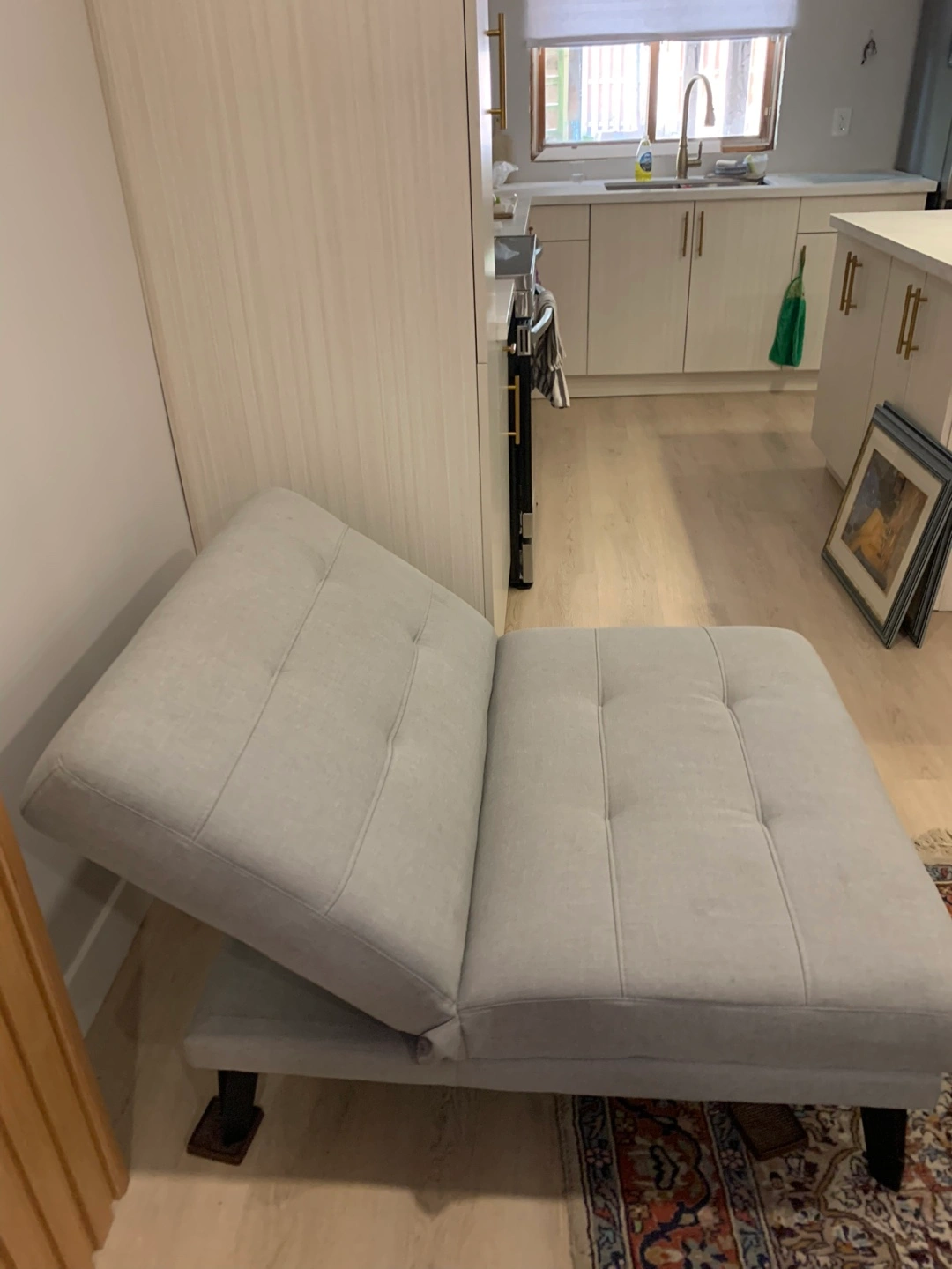 Grey futon chair. Folds out to a small bed/bench. Has black legs. Purchase from Costco excellent condition. When fully reclined like a bench dimension is 46” x 34”. Pickup area Whites Road and 401.