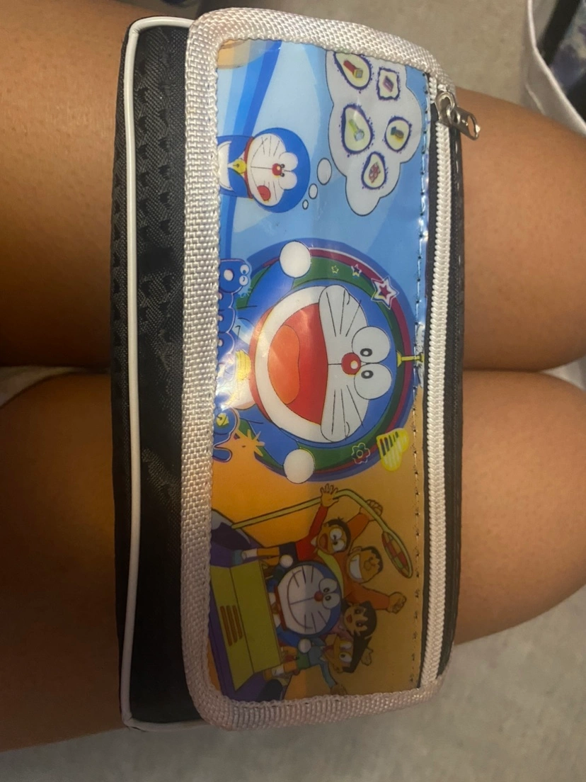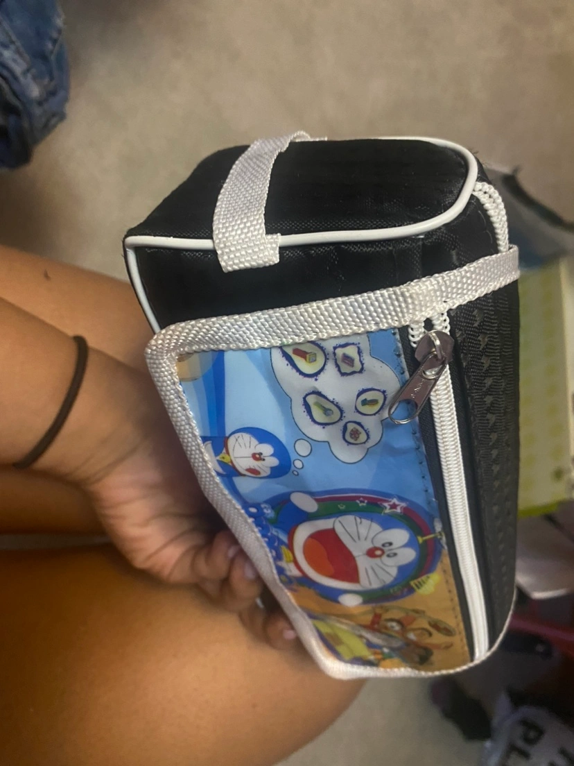 Black pencil case with a Doraemon design. Features a zipper closure and a handle. Bought a new one so selling it