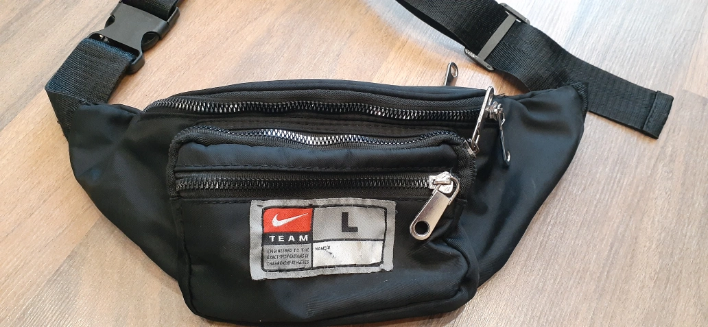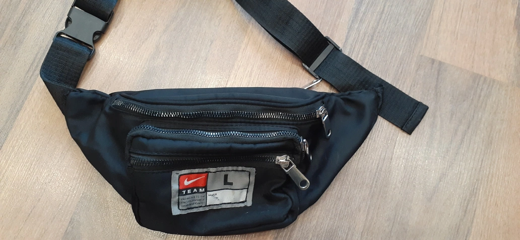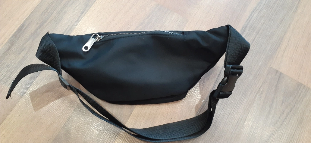 Black fanny pack with adjustable strap. Features two zippered compartments.