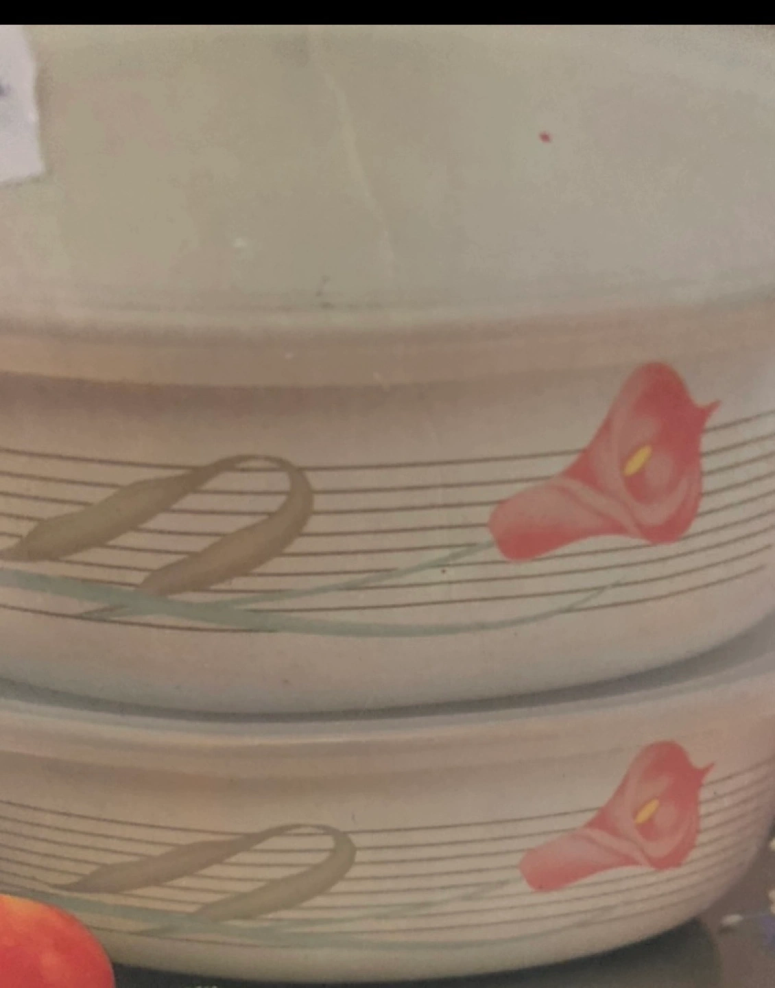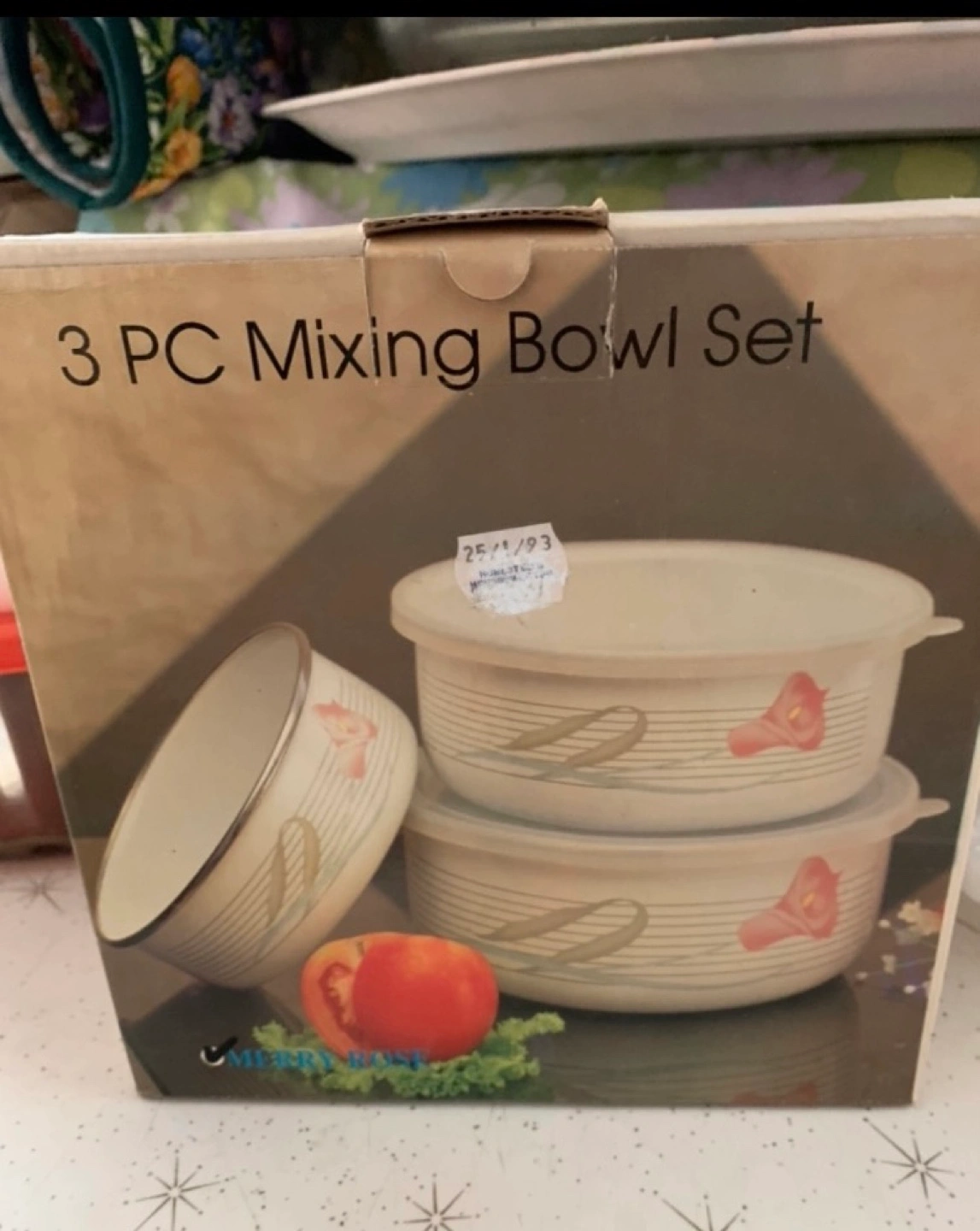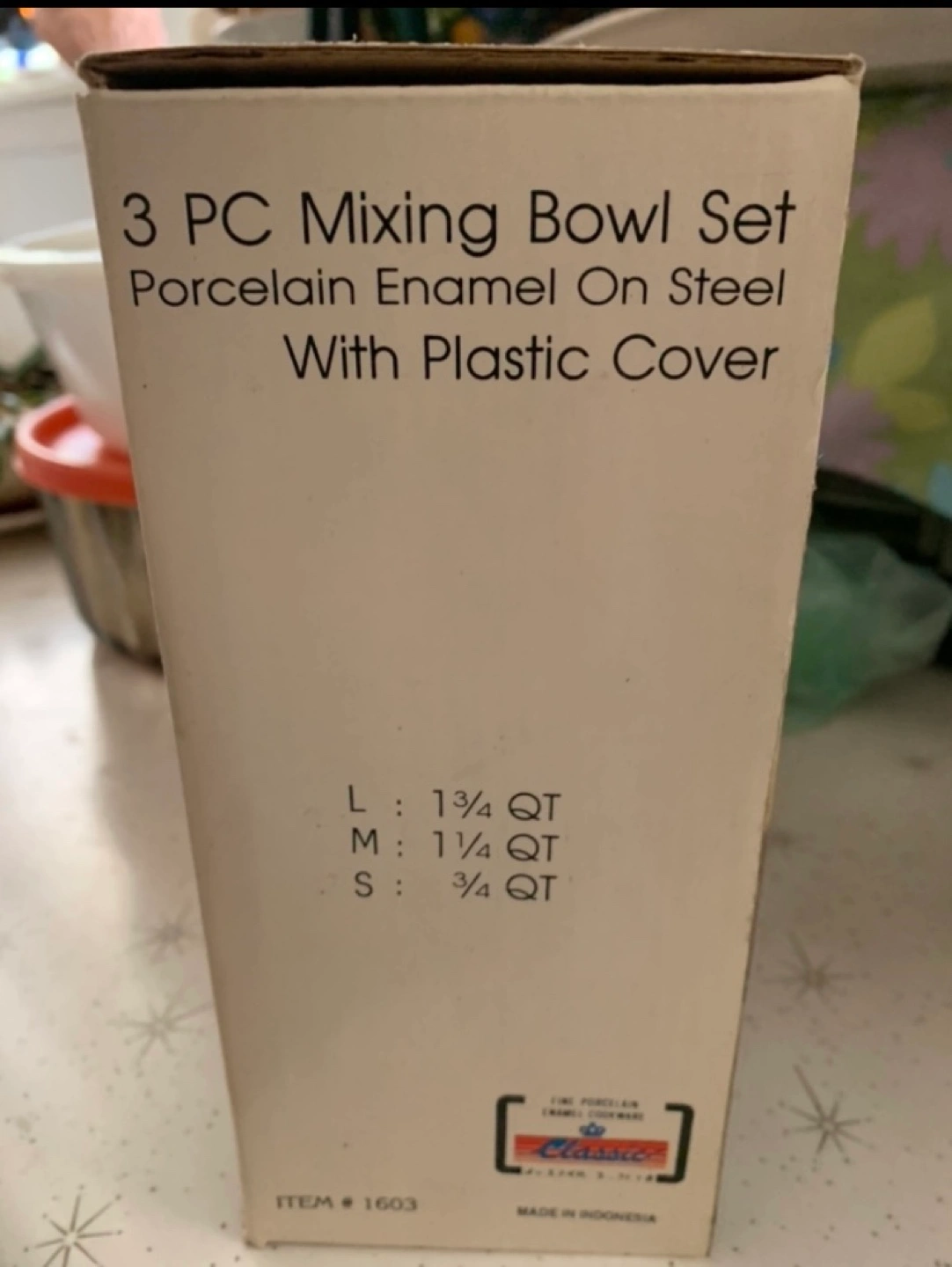 Porcelain enamel on steel mixing bowls - set of 3 bowls with plastic lids. Floral design Set includes a large, medium, and small bowl and lids NEW - never used (Purchased for over $30) Moving sale - non smoking & no pet household
